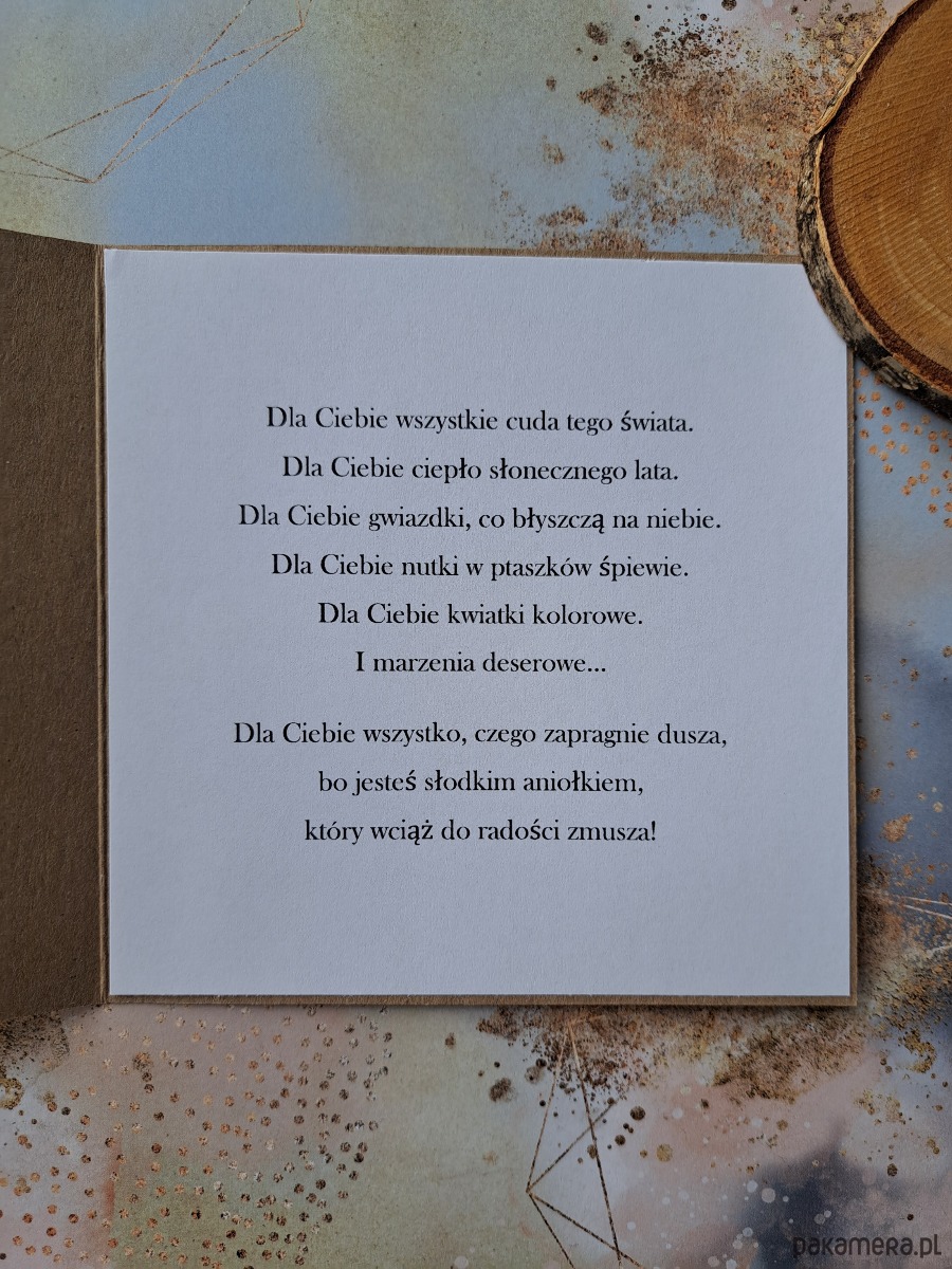 - wklejona kartka z gotowymi życzeniami (można zamienić na pustą)