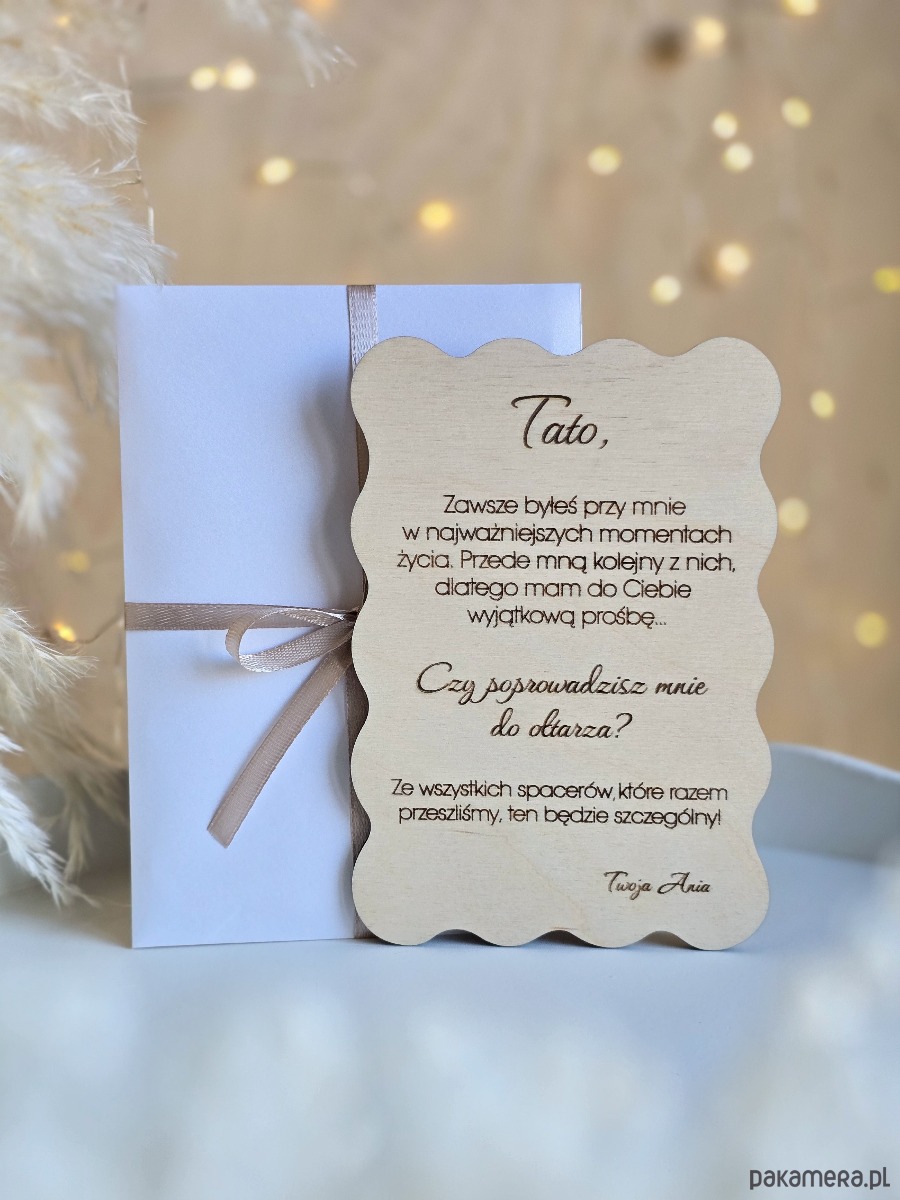 Są pytania, które mają szczególne znaczenie. Ta kartka powstała właśnie na jeden z takich momentów - kiedy chcesz poprosić tatę, aby poprowadził Cię do ołtarza w dniu ślubu. To falowana kartka ze sklejki z grawerowanym tekstem, zapakowana w elegancką, połyskującą kopertę - gotowa do wręczenia w tej wyjątkowej chwili.
