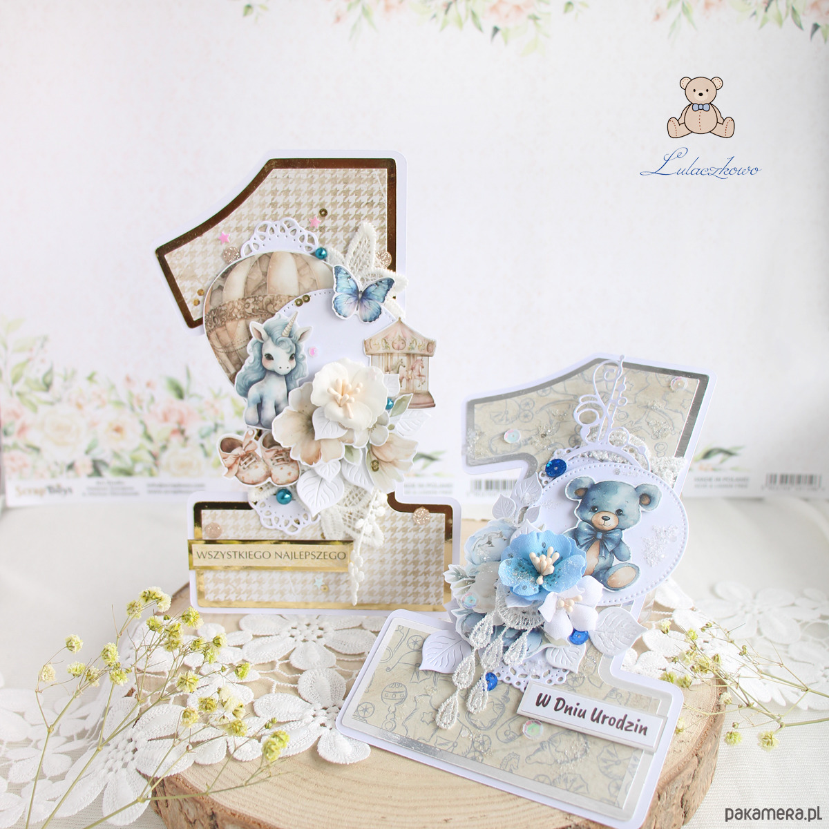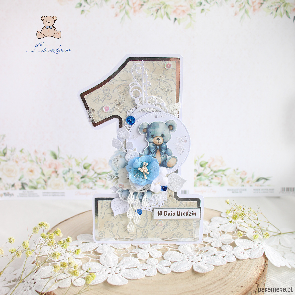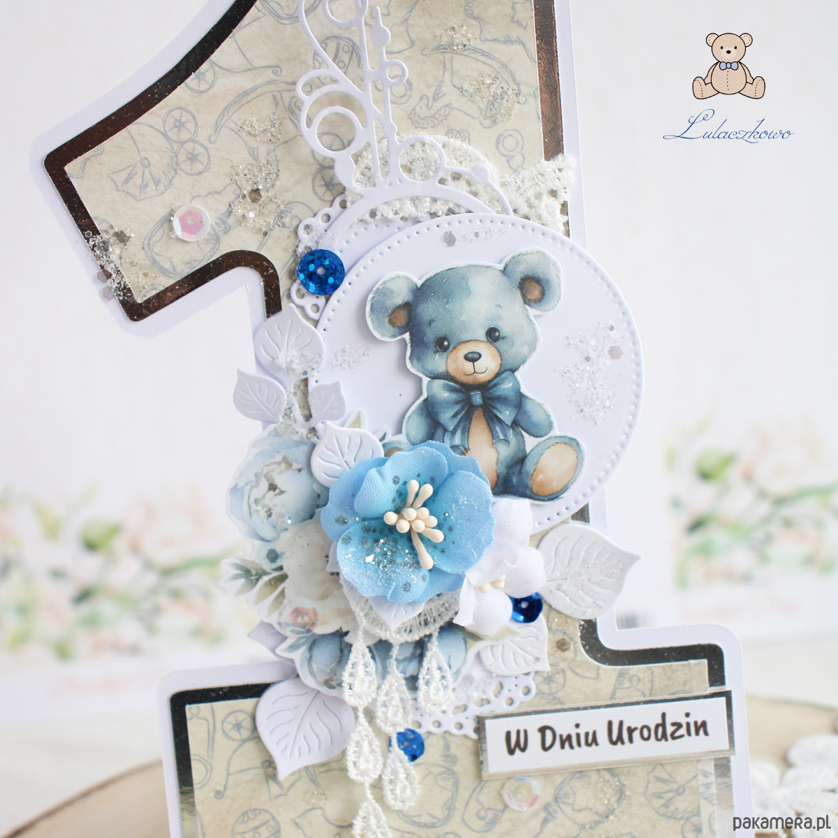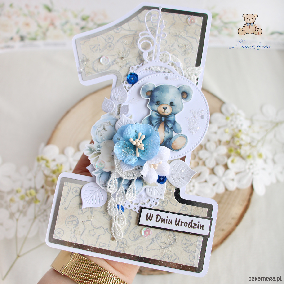 Piękna i nietuzinkowa, dziecięca kartka na roczek, w kształcie cyferki jedynki, wykonana z mixu dziecięcych kolekcji papierów, utrzymana w odcieniach beżu, błękitu i bieli z dodatkiem błyszczących, srebrnych akcentów. Kartka wykonana ręcznie z dbałością o każdy szczegół. Na środku znajduje się grafika uroczego misia, ozdobiona kompozycją kwiatową z ręcznie wykonanym kwiatuszkiem, dodatkowo zdobiona grafikami, cekinami, iskrzącymi drobinkami, a także napisem "W Dniu Urodzin" (na życzenie mogę dodać również imię dziecka, lub całkowicie zmienić napis na inny).