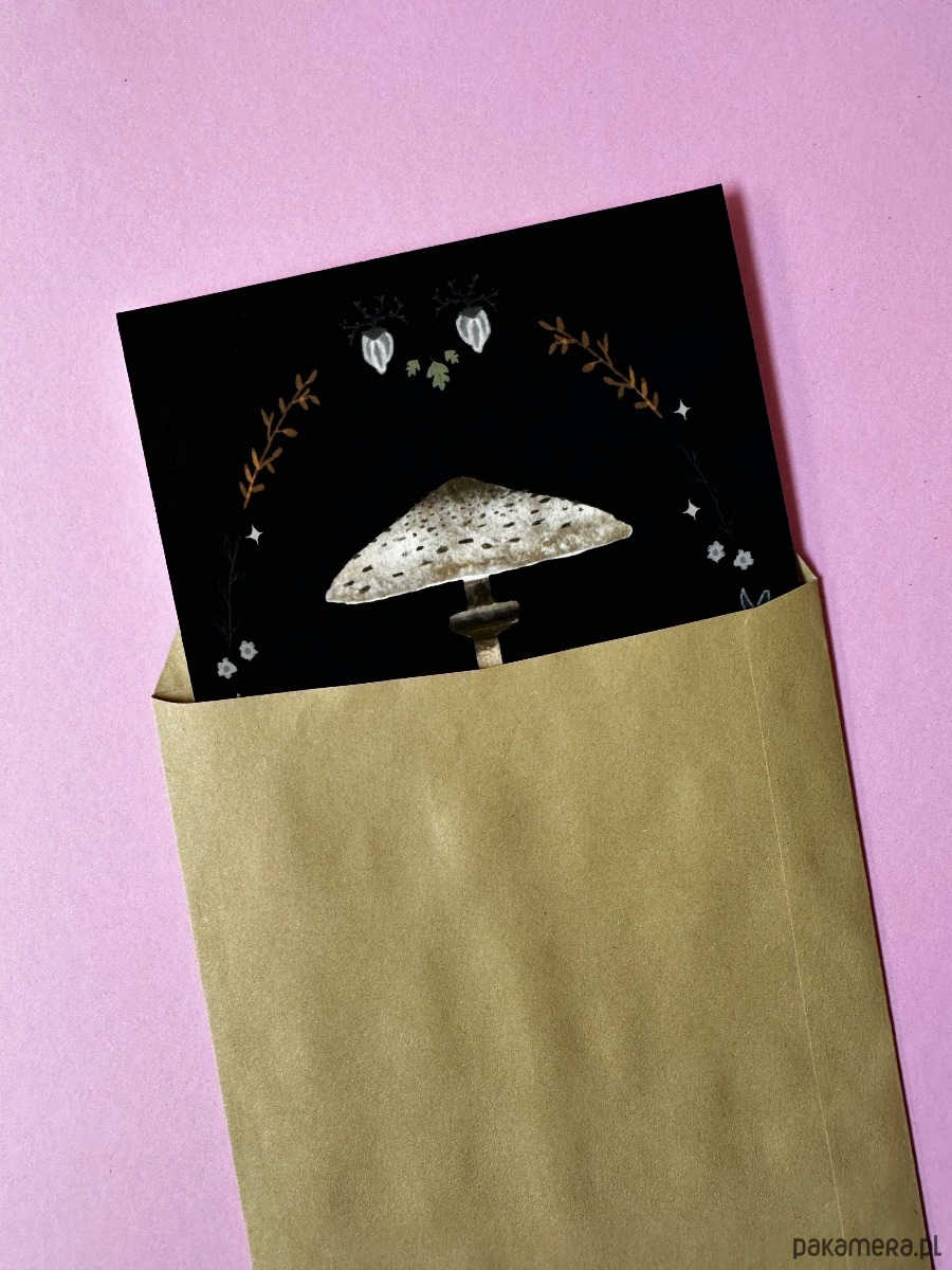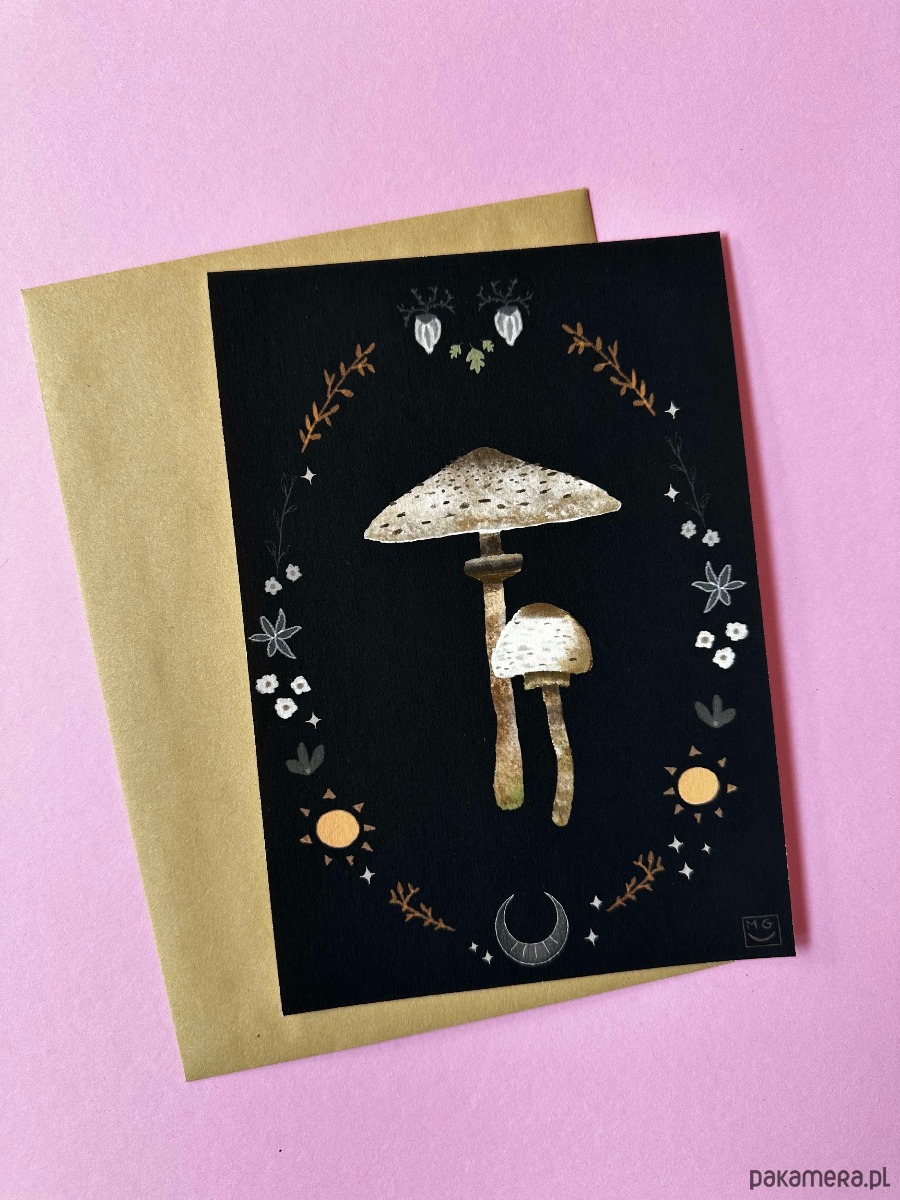 Grzybowa ilustracja o wymiarach 14,5 cm x 21 cm.
