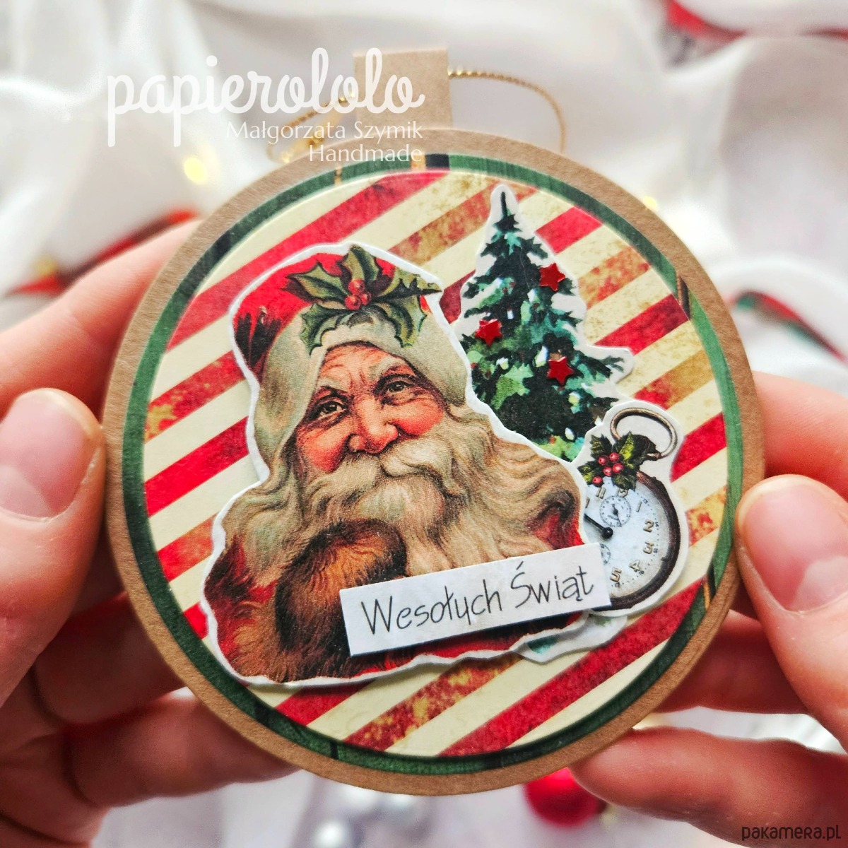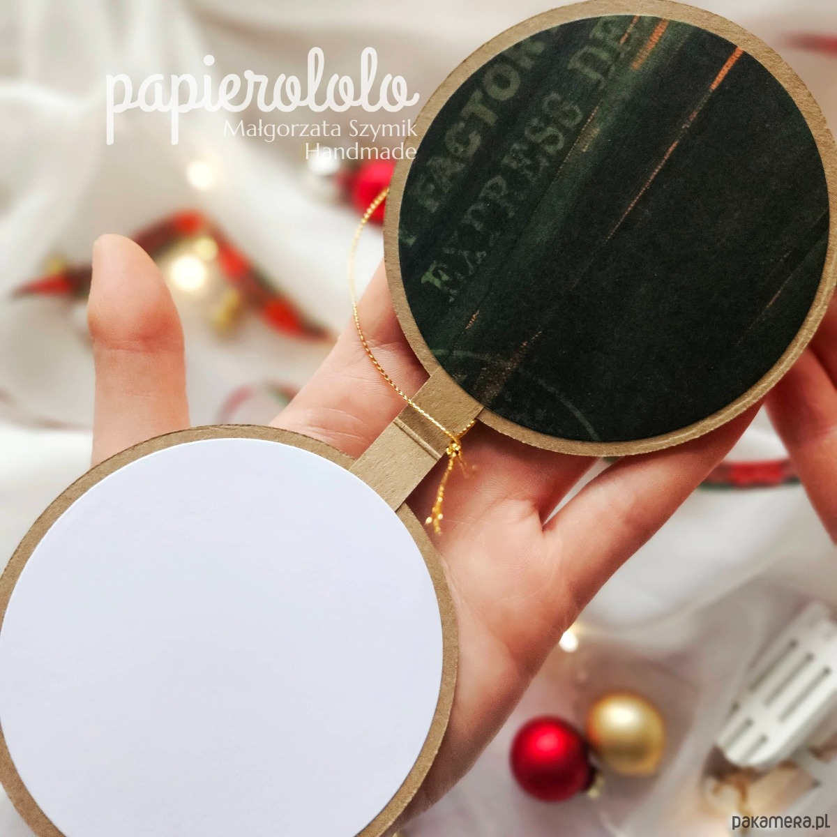 Kartka na bazie kół z miejscem na wypisanie życzeń lub dedykacji. Zawieszkę można użyć do podpisania prezentu lub, aby wysłać jako kartkę. Zawieszka potem może wisieć na choince jak bombka.