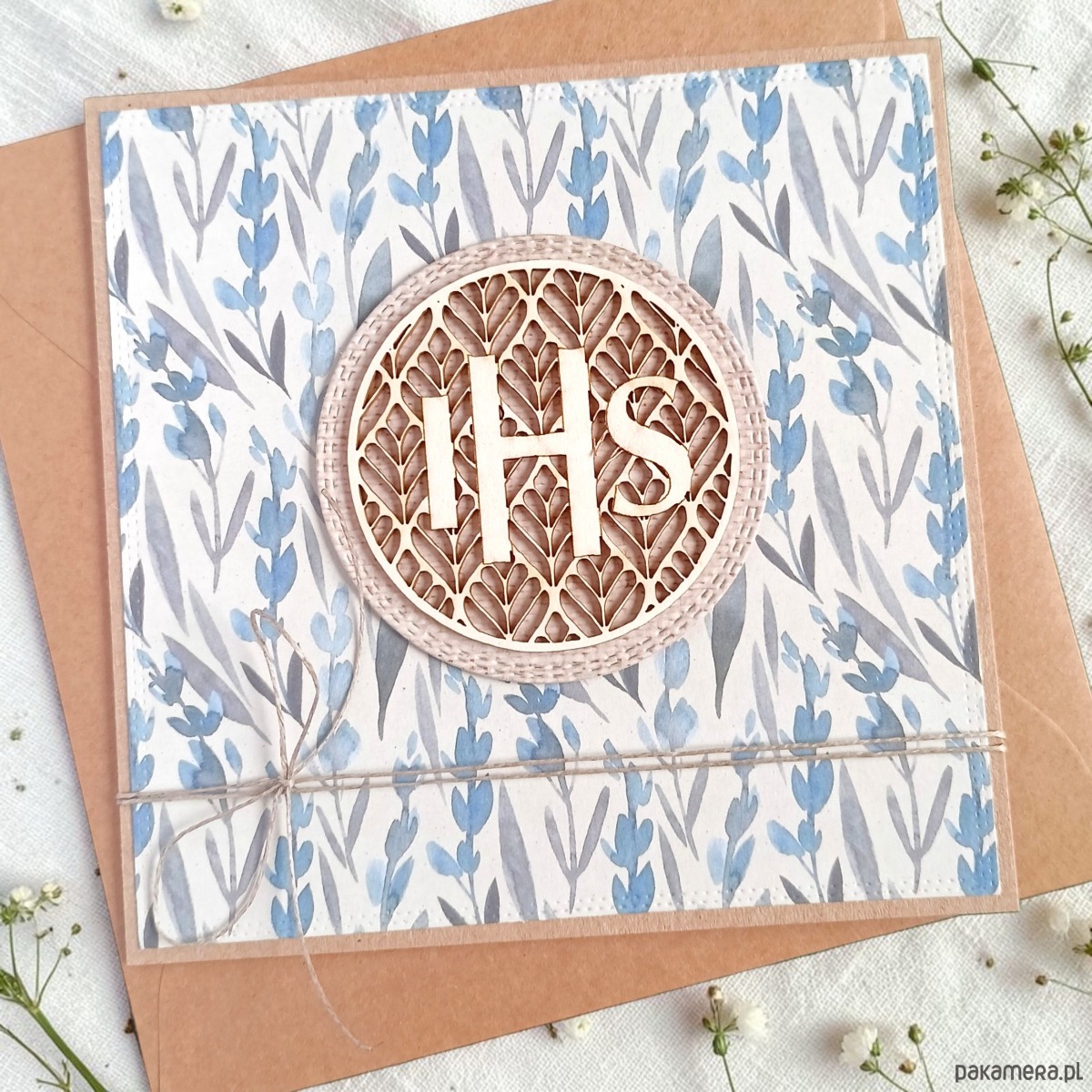 wykonana na bazie grubego kartonu eko-kraft (100% makulatury), ozdobiona wzorzystym kartonem oraz przestrzennym elementem z ażurową tekturką IHS,przewiązana jutowym sznurkiem.
