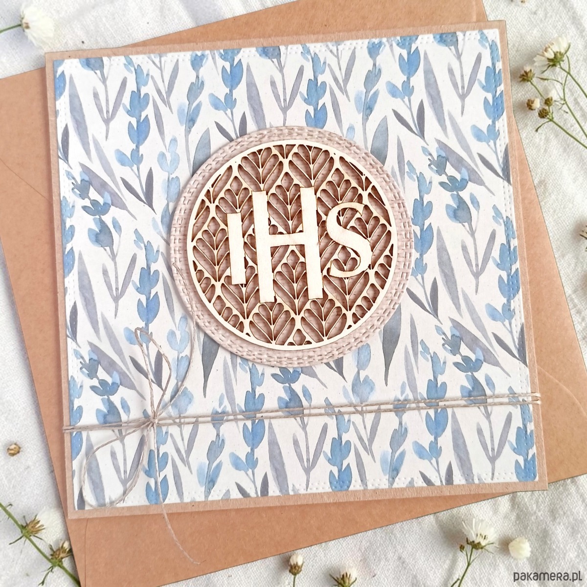 wykonana na bazie grubego kartonu eko-kraft (100% makulatury), ozdobiona wzorzystym kartonem oraz przestrzennym elementem z ażurową tekturką IHS,przewiązana jutowym sznurkiem.