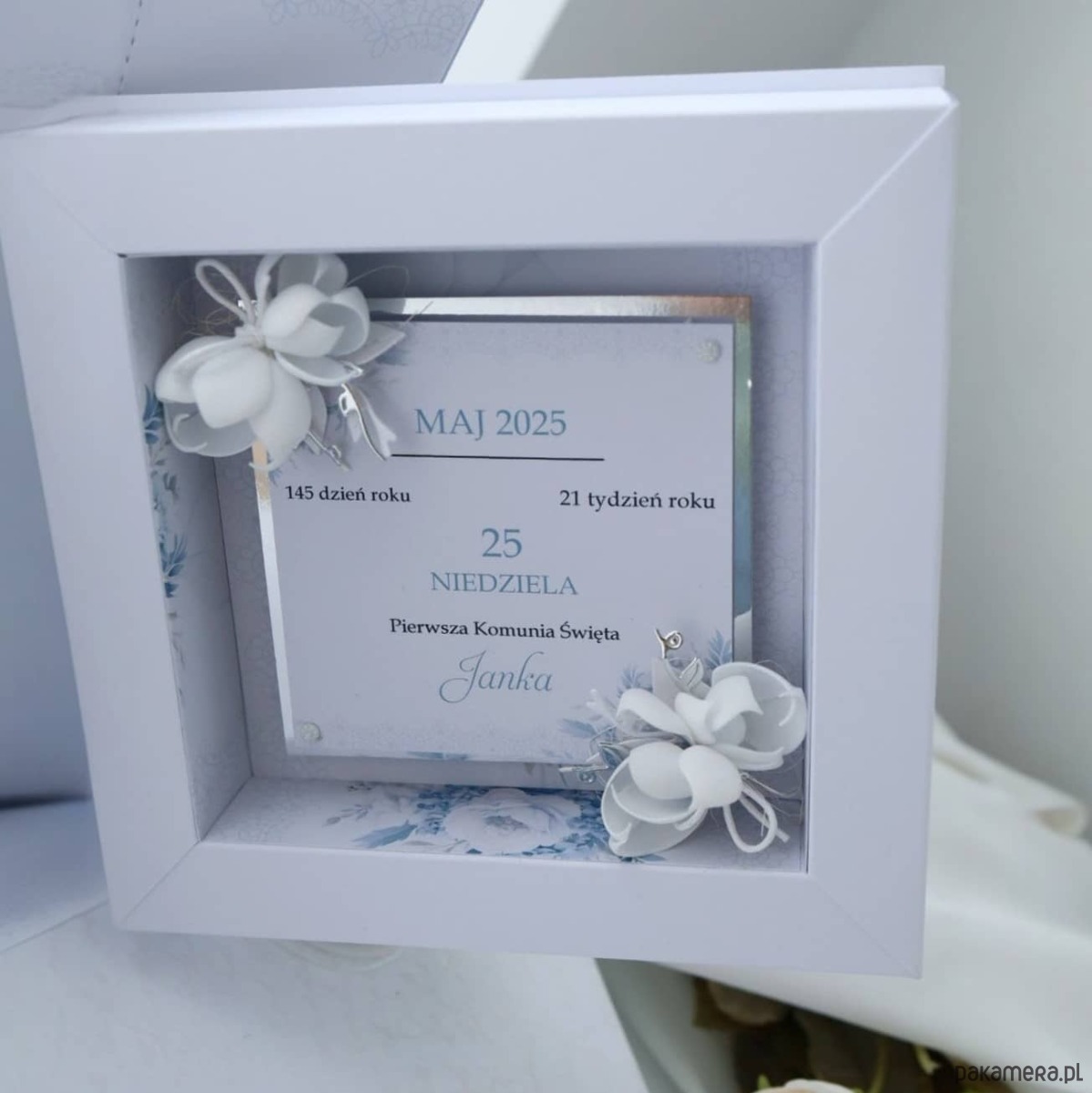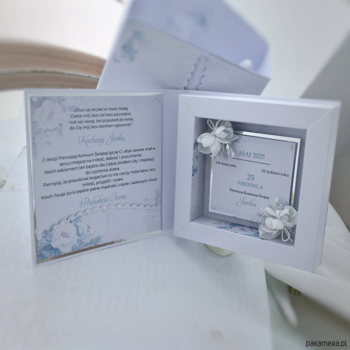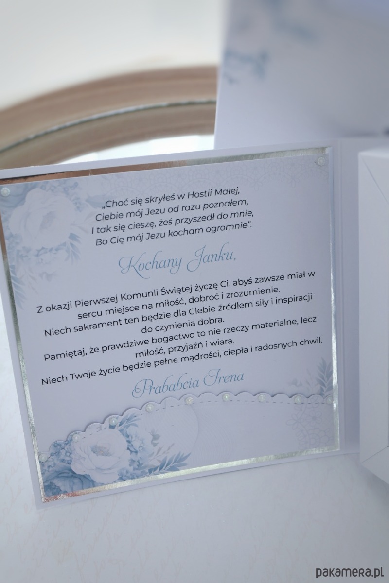 Personalizowana kartka na Pierwszą Komunię Świętą dla chłopca w formie księgi 3D to elegancki prezent i pamiątka w jednym. W środku znajdują się życzenia - możesz wybrać tekst taki jak na zdjęciu lub dodać własny, kieszonka na pieniądze oraz kartka z kalendarza lub zdjęcie dziecka.
