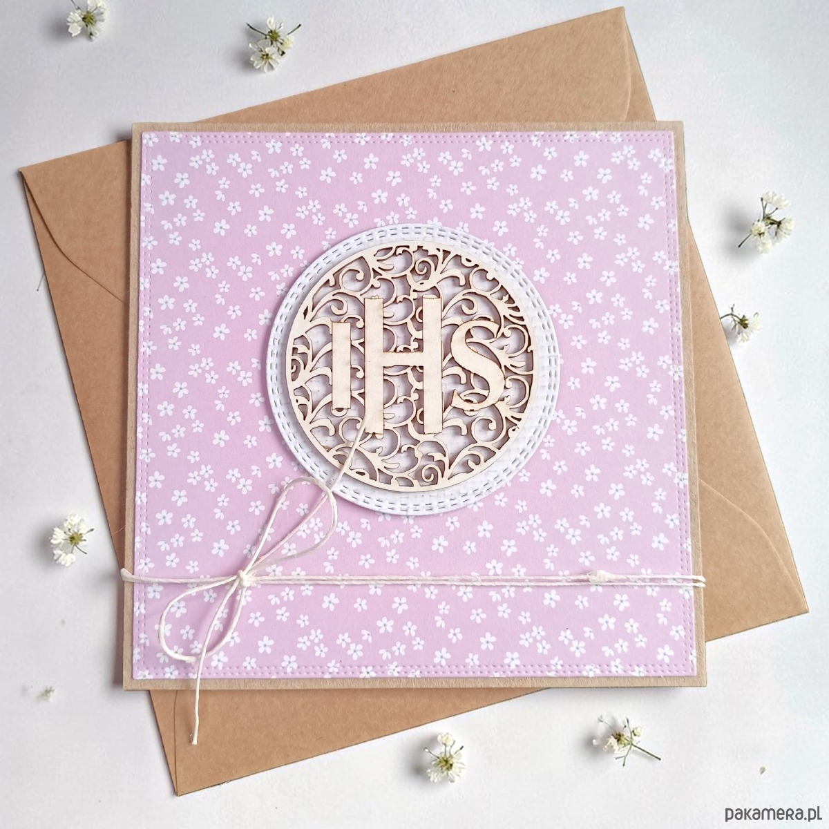 wykonana na bazie grubego kartonu eko-kraft (100% makulatury), ozdobiona wzorzystym kartonem oraz przestrzennym elementem z ażurową tekturką IHS,przewiązana jutowym sznurkiem.