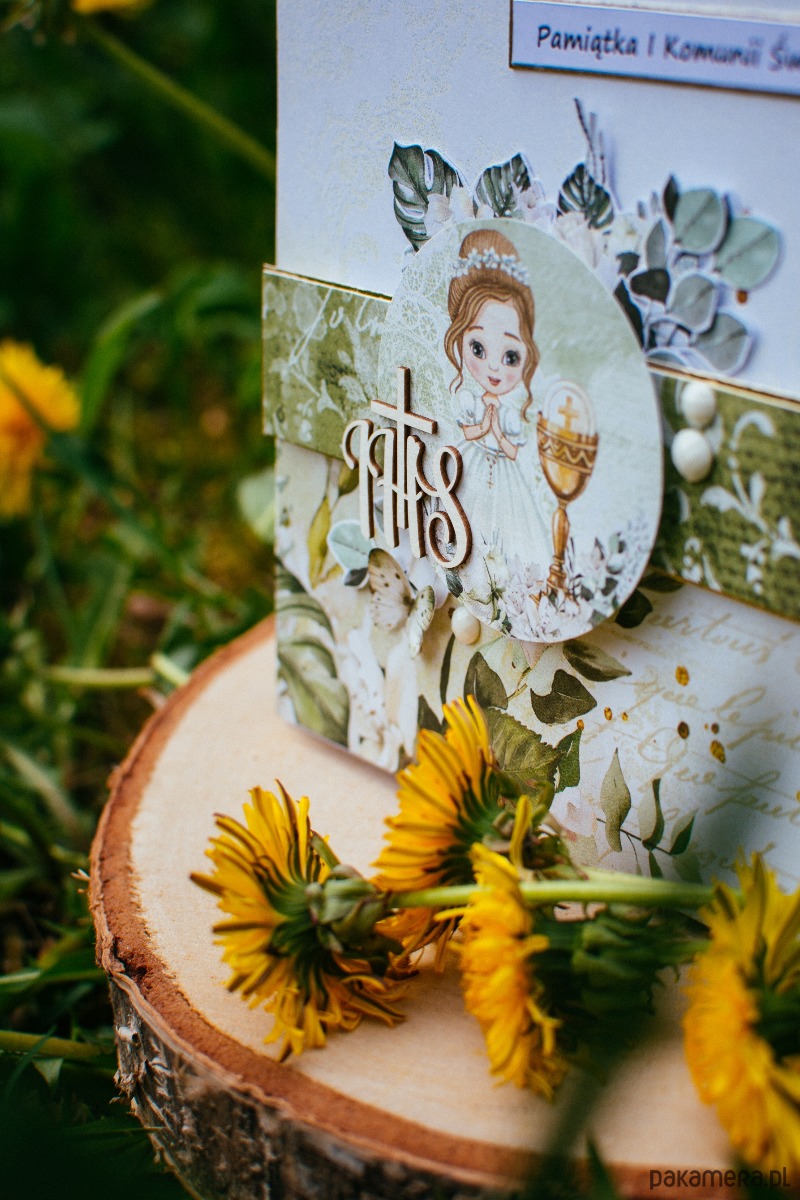 Ręcznie wykonana pamiątka I Komunii Świętej dla dziewczynki. Zdobiona zarówno w części frontowej jak i wewnątrz (w kartce są już gotowe życzenia). Delikatnie zdobiona przestrzenną kompozycją. Wykonana z najwyższej jakości papierów polskiego producenta z dodatkiem papieru lustrzanego. Do kartki dołączona jest biała koperta.