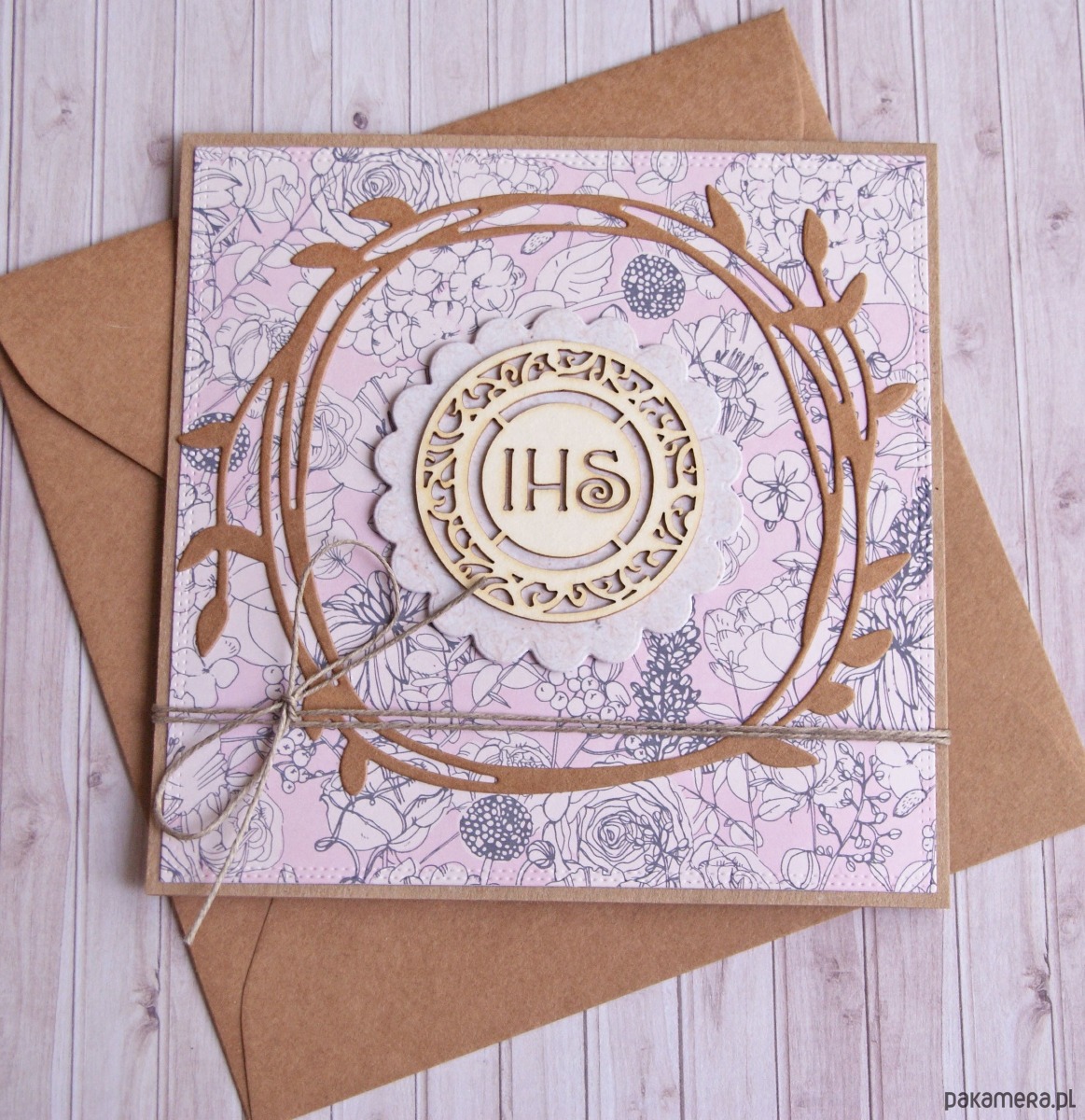 wykonana na bazie grubego kartonu eko-kraft (100% makulatury), ozdobiona wzorzystym katonem , tekturowym wianuszkiem oraz lekko przestrzennym elementem z tekturką IHS,przewiązana jutowym sznurkiem.
