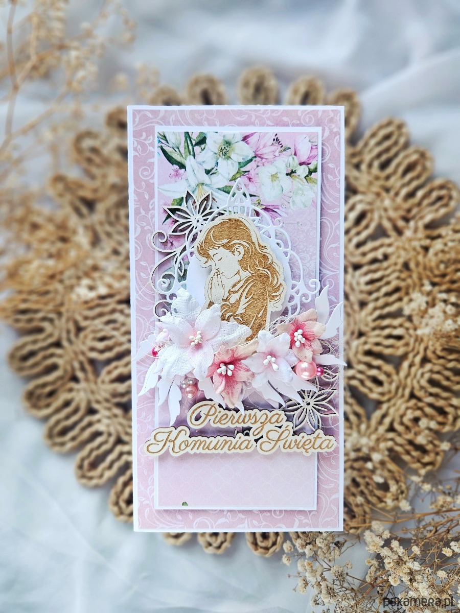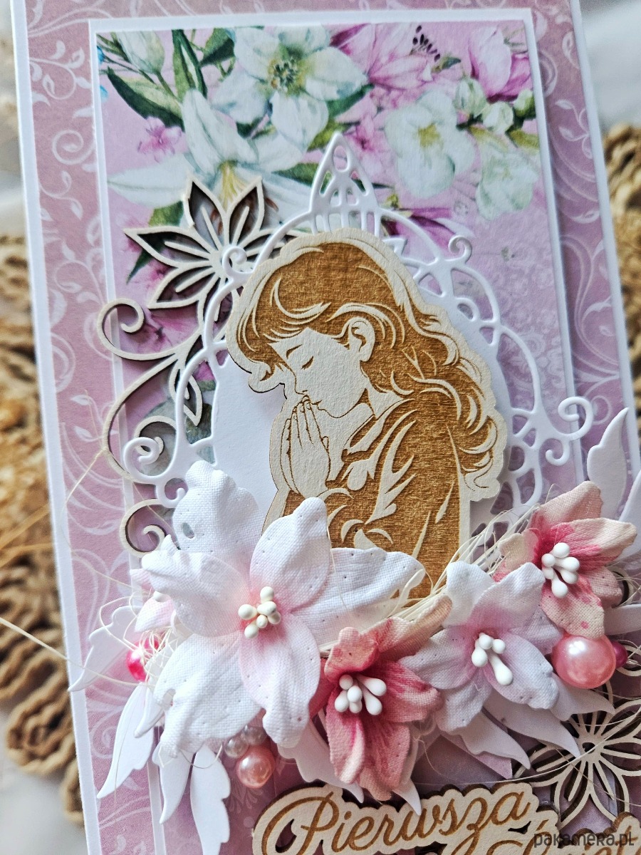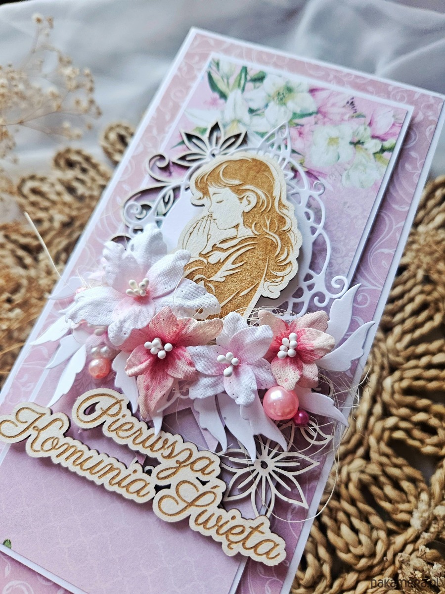 Kartka oklejona papierami z nadrukiem w kolorze różowym. Na froncie sylwetka dziwczynki na drewienku oraz napis. Jako dodatki kwiaty z materiału, elementy papierowe oraz perełki.