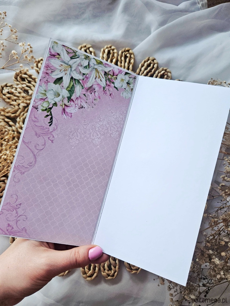 W środku miejsce na życzenia. Mogę przesłać ci propozycje do wyboru, wydrukować i wkleić twoje życzenia lub pozostawić miejsce puste do samodzielnego uzupełnienia.