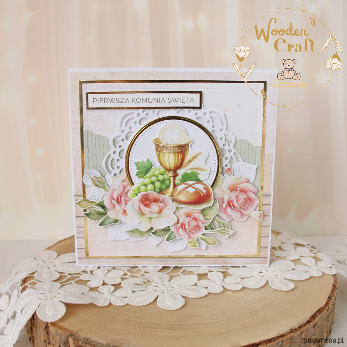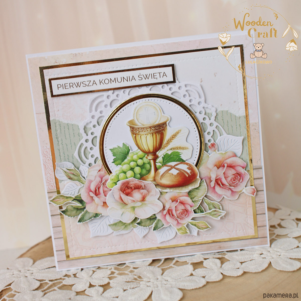 Piękna, elegancka kartka komunijna, pamiątka Pierwszej Komunii Świętej, wykonana ręcznie z najwyższą starannością, z cudownej kolekcji papierów "Rose Wine", utrzymana w pastelowych odcieniach malinowego różu, kremu i bieli, z dodatkiem złotych, błyszczących akcentów. Na środku kartki umieszona została grafika kielicha komunijnego z winogronami oraz chlebem otoczona kompozycją kwiatową z grafik przedstawiających róże oraz napisem "Pierwsza Komunia Święta"- do napisu mogę również dodać imię dziecka.