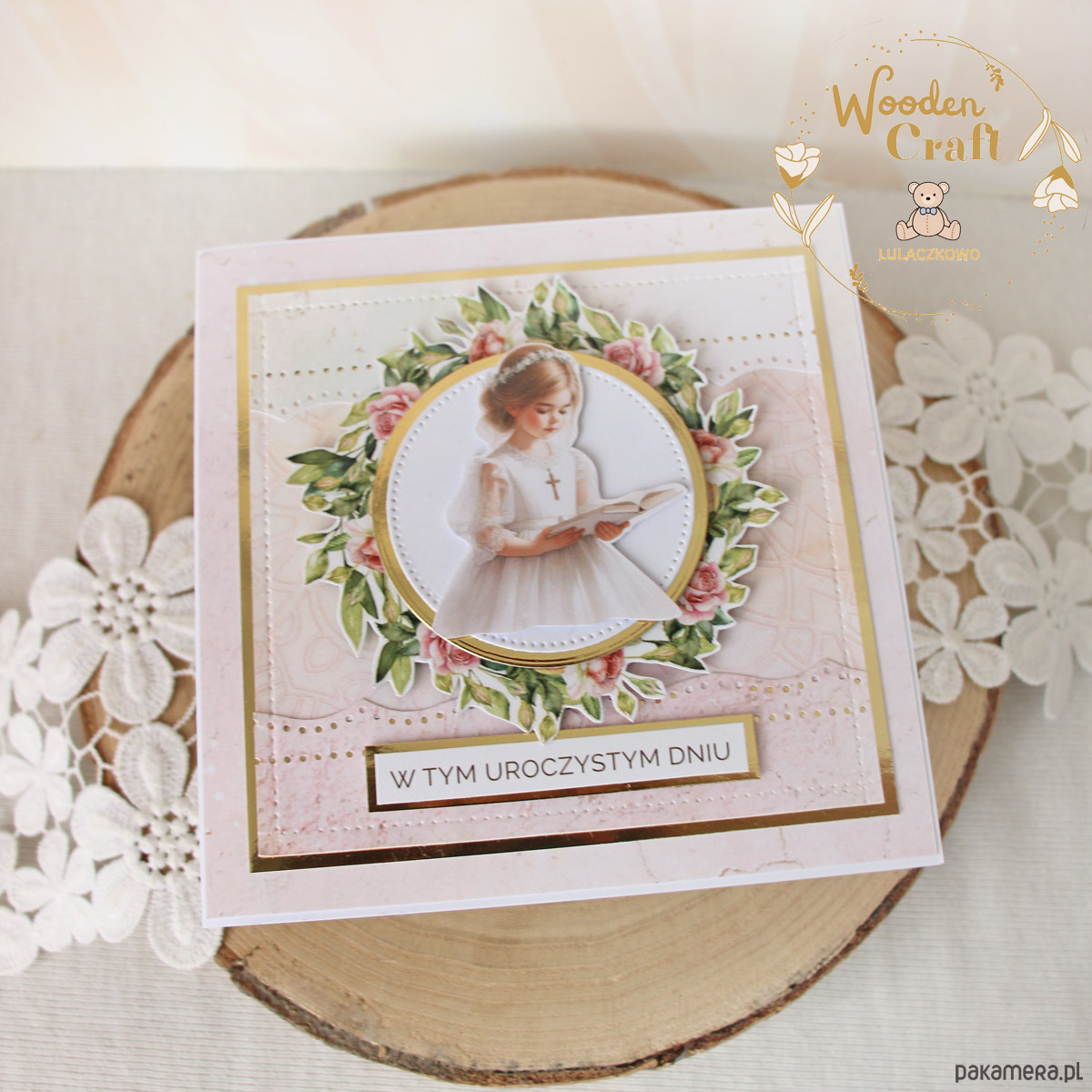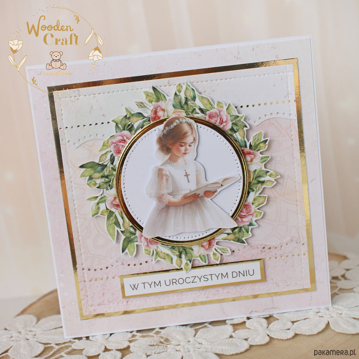 Piękna, elegancka kartka komunijna, pamiątka Pierwszej Komunii Świętej mieszcząca się do koperty, wykonana ręcznie z najwyższą starannością, z cudownej kolekcji papierów "Rose Wine", utrzymana w pastelowych odcieniach malinowego różu, kremu i bieli, z dodatkiem złotych, błyszczących akcentów. Na środku kartki umieszona została grafika dziewczynki komunijnej czytającej biblię, otoczona kwiatowym wianuszkiem, dodatkowo napis "W Tym Uroczystym Dniu"- do napisu mogę również dodać imię dziecka lub całkowicie zmienić go na inny.