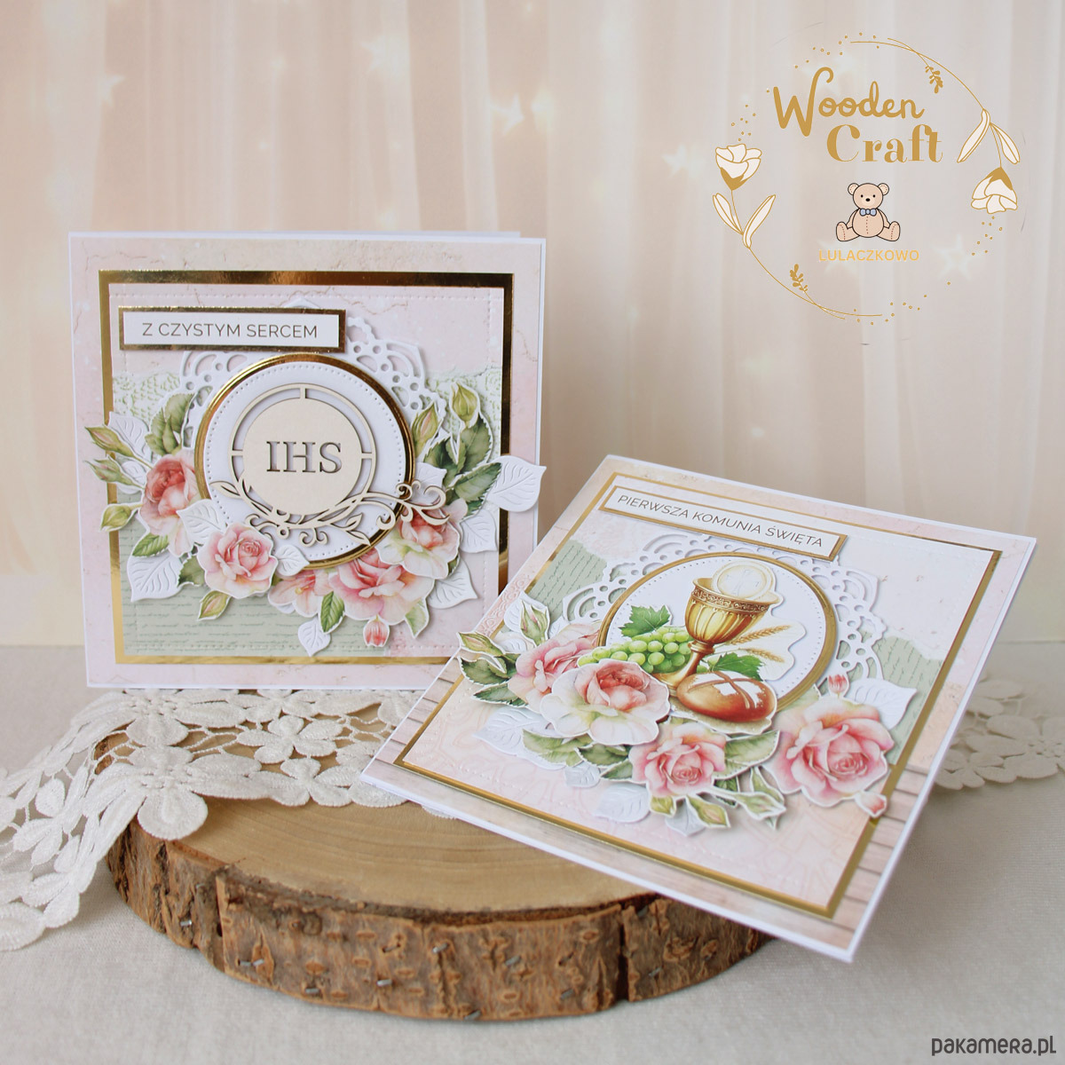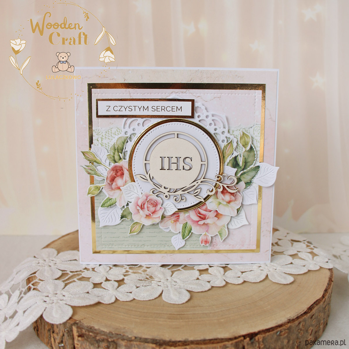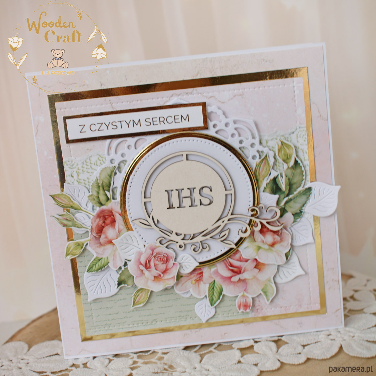 Piękna, elegancka kartka komunijna, pamiątka Pierwszej Komunii Świętej, wykonana ręcznie z najwyższą starannością, z cudownej kolekcji papierów "Rose Wine", utrzymana w pastelowych odcieniach malinowego różu, kremu i bieli, z dodatkiem złotych, błyszczących akcentów. Na środku kartki umieszona została tekturka hostii świętej otoczona kompozycją kwiatową z grafik przedstawiających róże oraz napisem "Z Czystym Sercem"- do napisu mogę również dodać imię dziecka lub całkowicie zmienić go na inny.