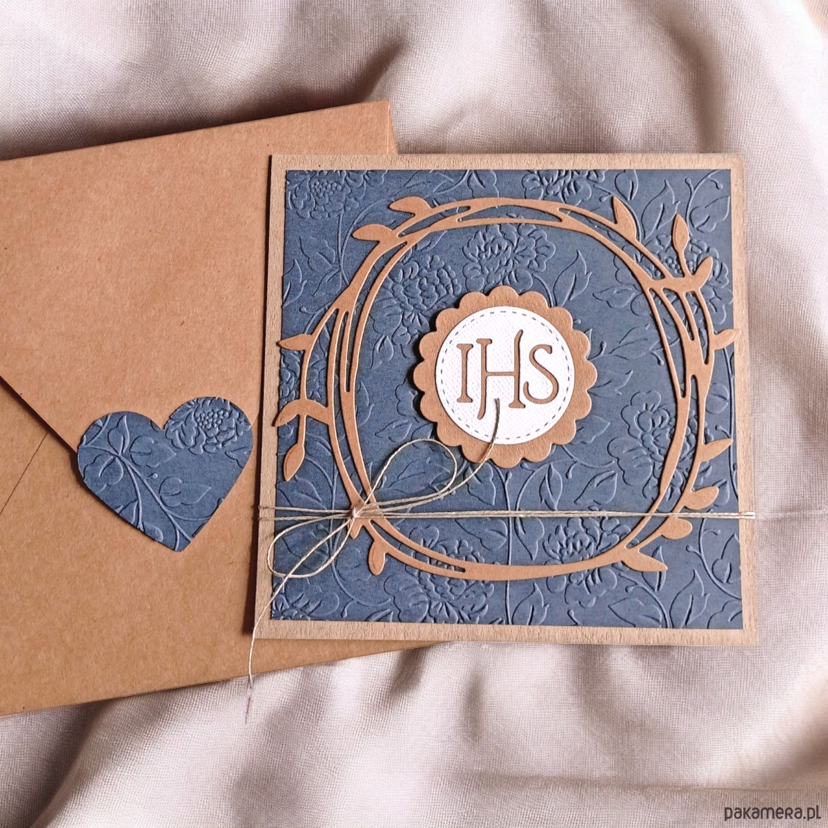 wykonana na bazie grubego kartonu eko-kraft (100% makulatury), ozdobiona fakturowanym przeze mnie GRANATOWYM kartonem, tekturowym wianuszkiem oraz elementem przestrzennym (IHS),przewiązana jutowym sznurkiem.