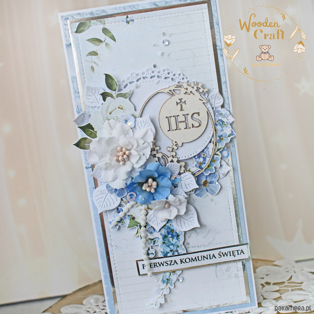 Piękna i elegancka pamiątka Pierwszej Komunii Świętej zamknięta w białym pudełeczku z okienkiem, wykonana ręcznie z najwyższą starannością, z cudownej i delikatnej kolekcji papierów "Lovely Day in Blue", utrzymana w odcieniach błękitu i bieli z dodatkiem srebrnych, błyszczących akcentów. Na środku kartki umieszona została tekturka Hostia Święta, ozdobiona kompozycją kwiatową z ręcznie robionymi kwiatami, udekorowana kryształkami oraz napisem "Pierwsza Komunia Święta"