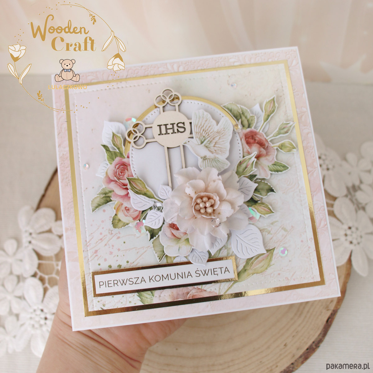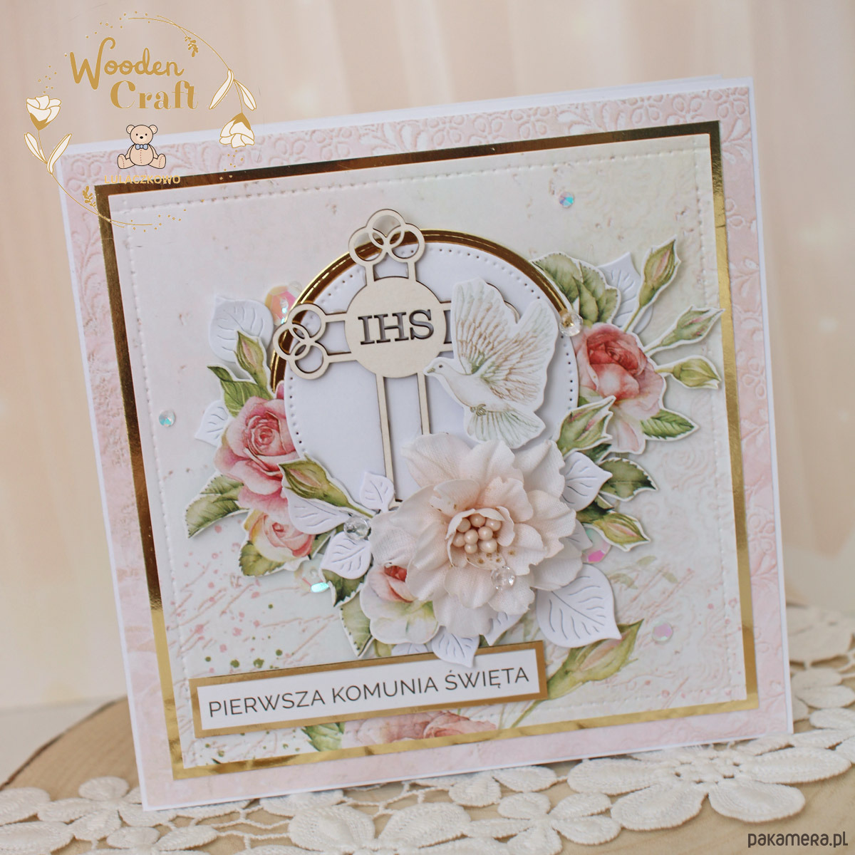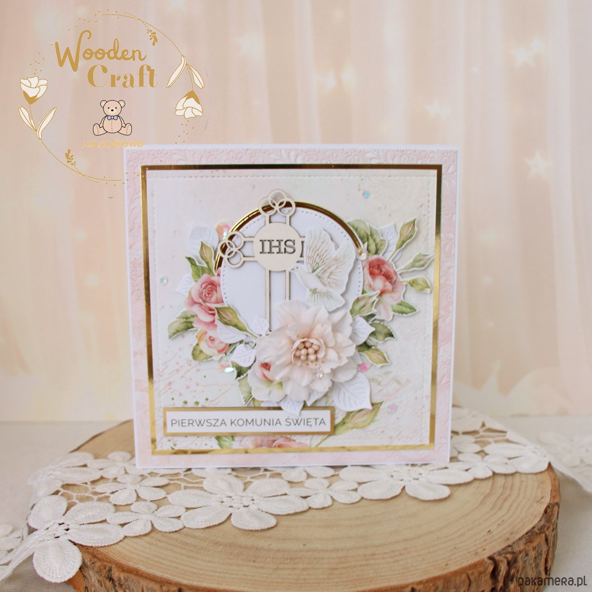 Piękna, elegancka kartka komunijna, pamiątka Pierwszej Komunii Świętej, wykonana ręcznie z najwyższą starannością, z cudownej kolekcji papierów "Rose Wine", utrzymana w pastelowych odcieniach malinowego różu, kremu i bieli, z dodatkiem złotych, błyszczących akcentów. Na środku kartki umieszona została tekturka przedstawiająca ażurowy krzyż z hostią świętą oraz grafiką gołębicy, otoczony kompozycją kwiatową, z ręcznie wykonanymi, materiałowymi kwiatami, oraz napisem "Pierwsza Komunia Święta"- do napisu mogę również dodać imię dziecka.