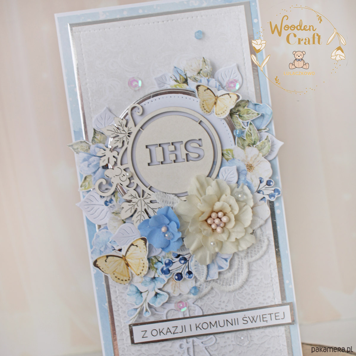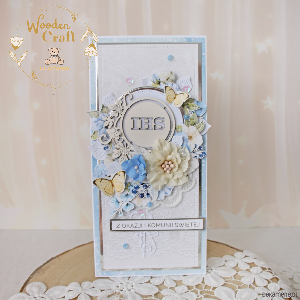 Piękna, elegancka kartka komunijna, pamiątka Pierwszej Komunii Świętej, wykonana ręcznie z najwyższą starannością, z cudownej kolekcji papierów "Sapphire Days", utrzymana w pastelowych odcieniach błękitu, kremu i bieli, z dodatkiem złotych, błyszczących akcentów. Na środku kartki umieszona została tekturka przedstawiająca hostię świętą z winoroślą, otoczoną kompozycją kwiatową, z ręcznie wykonanymi, materiałowymi kwiatami, ozdobiona motylkami oraz napisem "Z okazji Pierwszej Komunii Świętej"- do napisu mogę również dodać imię dziecka lub całkowicie zmienić go na inny.