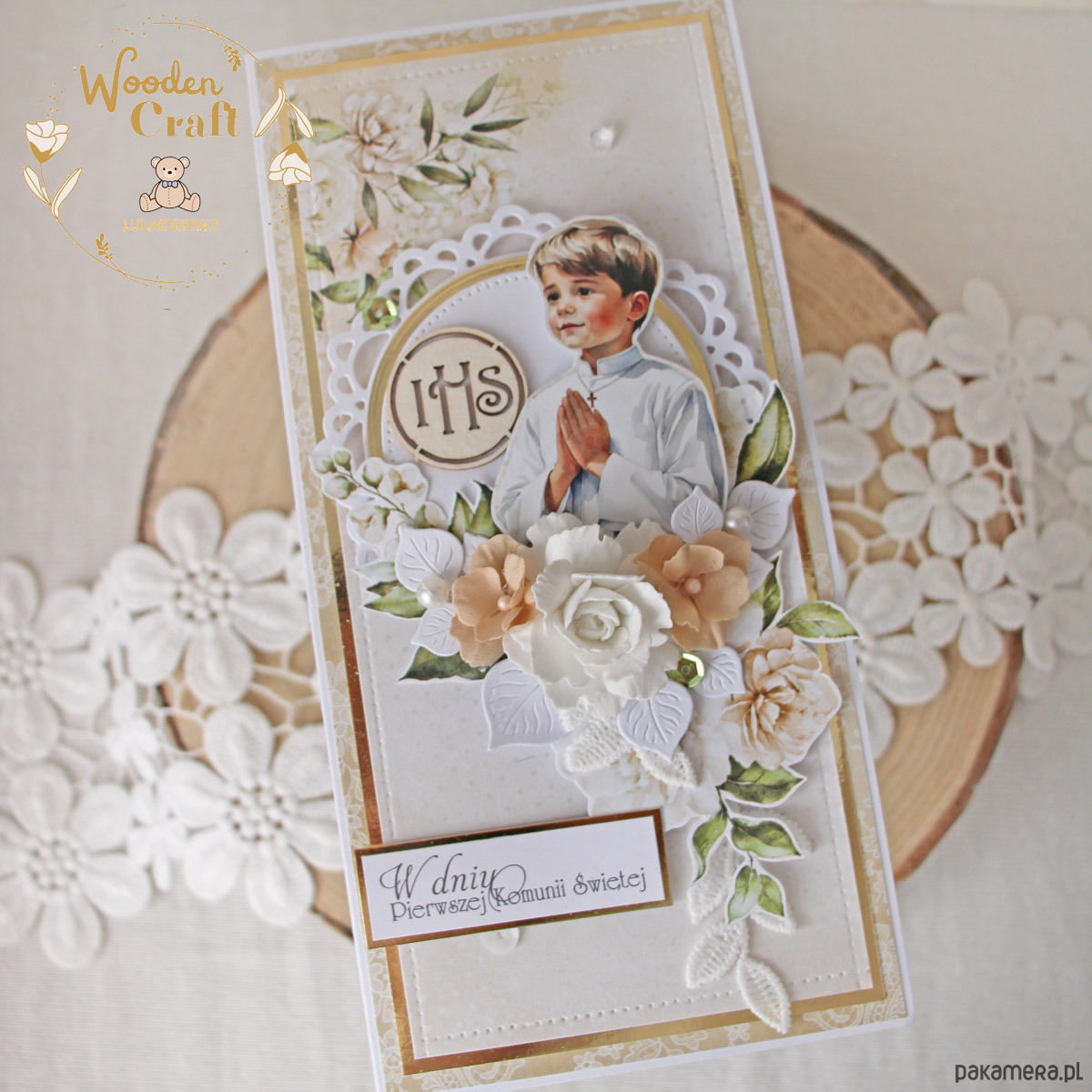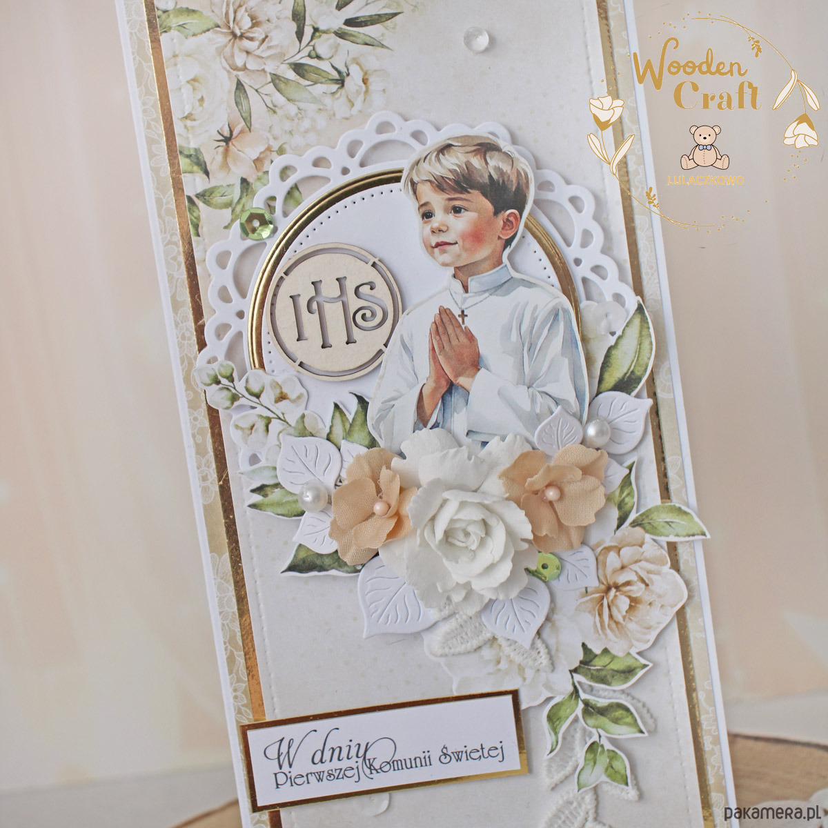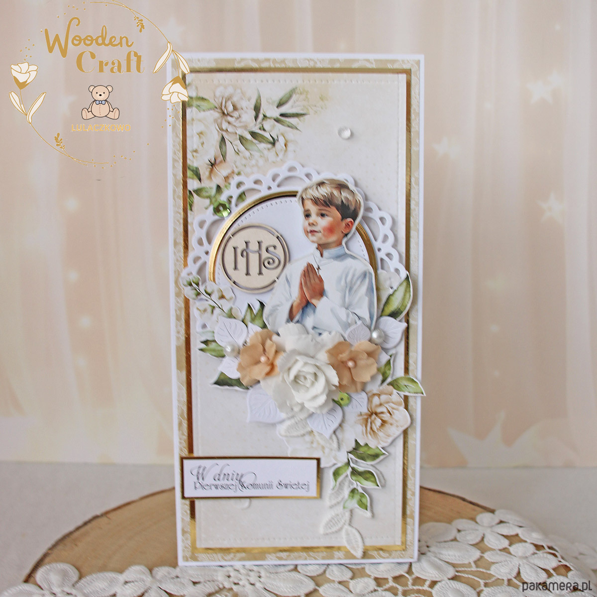Piękna i elegancka pamiątka Pierwszej Komunii Świętej zamknięta w białym pudełeczku z okienkiem, wykonana ręcznie z najwyższą starannością, z cudownej i delikatnej kolekcji papierów "Simple Story", utrzymana w odcieniach delikatnego beżu, zgaszonej zieleni oraz bieli z dodatkiem złotych, błyszczących akcentów. Na środku kartki umieszona została grafika chłopca komunijnego w towarzystwie hostii, ozdobiona kompozycją kwiatową z ręcznie robionymi kwiatami, udekorowana koronką, kryształkami oraz napisem "W Dniu Pierwszej Komunii Świętej"- do napisu mogę również dodać imię dziecka lub całkowicie zmienić go na inny.