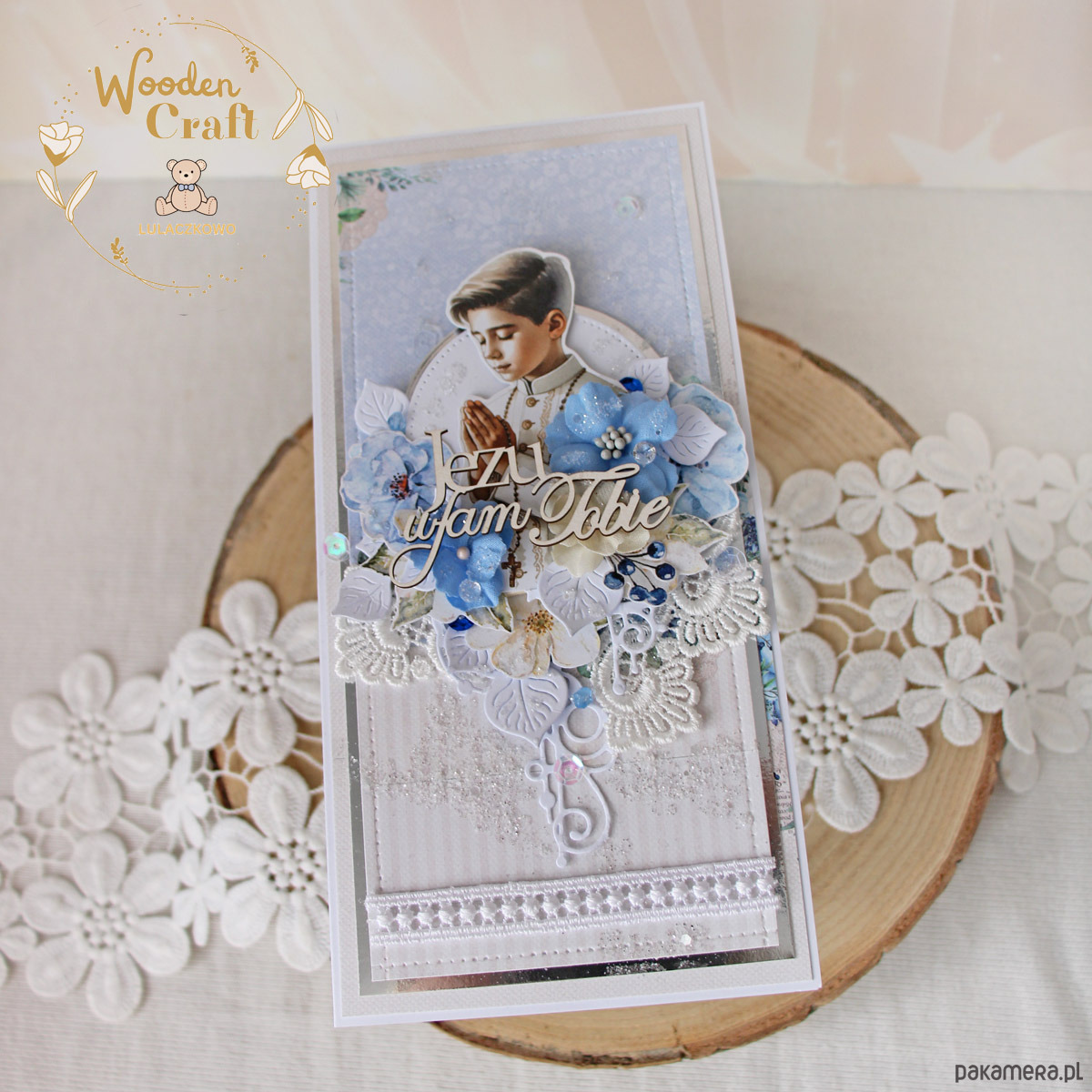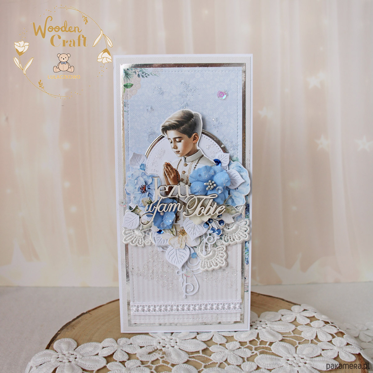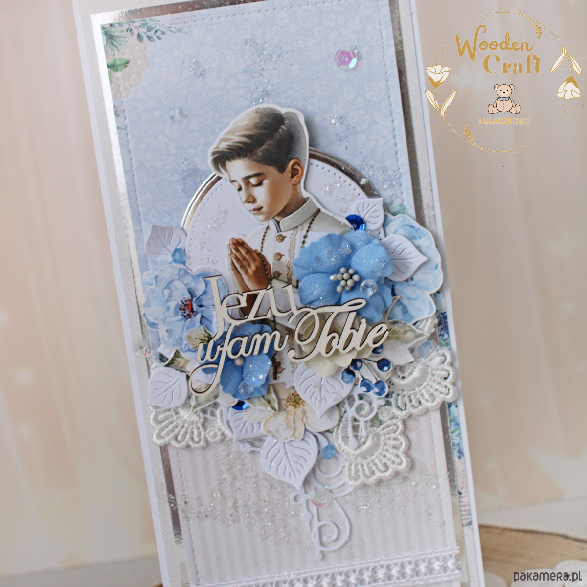 Piękna i elegancka pamiątka Pierwszej Komunii Świętej zamknięta w białym pudełeczku z okienkiem, wykonana ręcznie z najwyższą starannością, z cudownej i delikatnej kolekcji papierów "Sapphire Days", utrzymana w odcieniach delikatnego błękitu, beżu oraz bieli z dodatkiem srebrnych, błyszczących akcentów. Na środku kartki umieszona została grafika modlącego się chłopca komunijnego, ozdobiona kompozycją kwiatową z ręcznie robionymi kwiatami, udekorowana koronką, kryształkami oraz tekturkowym napisem "Jezu ufam Tobie".