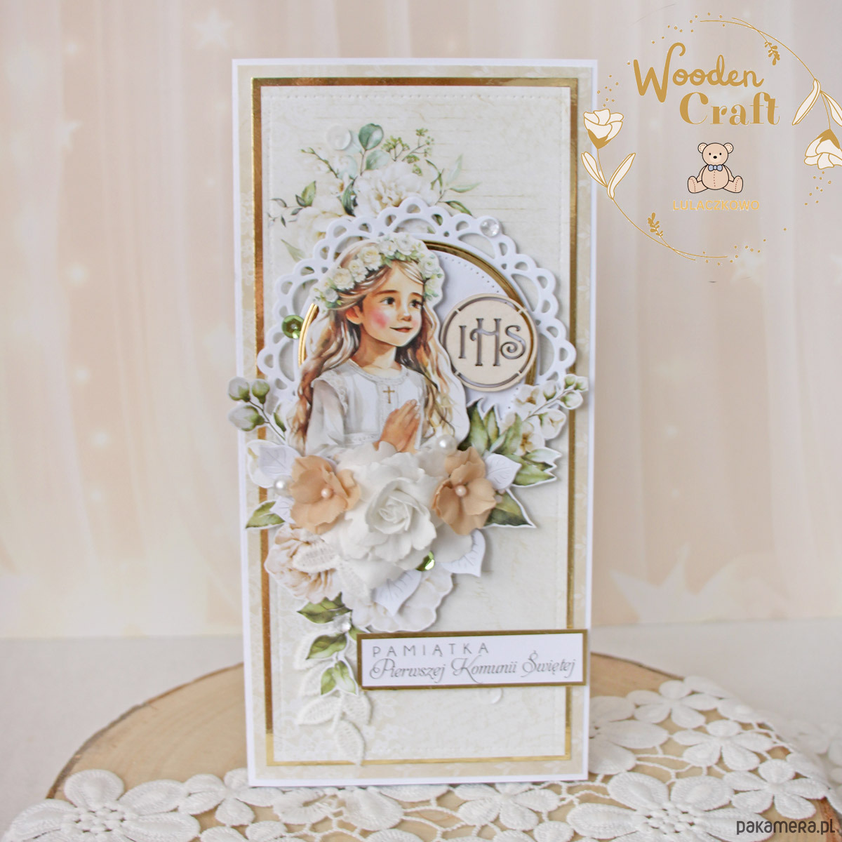Piękna i elegancka pamiątka Pierwszej Komunii Świętej zamknięta w białym pudełeczku z okienkiem, wykonana ręcznie z najwyższą starannością, z cudownej i delikatnej kolekcji papierów "Simple Story", utrzymana w odcieniach delikatnego beżu, zgaszonej zieleni oraz bieli z dodatkiem złotych, błyszczących akcentów. Na środku kartki umieszona została grafika dziewczynki komunijnej w towarzystwie hostii, ozdobiona kompozycją kwiatową z ręcznie robionymi kwiatami, udekorowana koronką, kryształkami oraz napisem "Pamiątka Pierwszej Komunii Świętej"- do napisu mogę również dodać imię dziecka lub całkowicie zmienić go na inny.