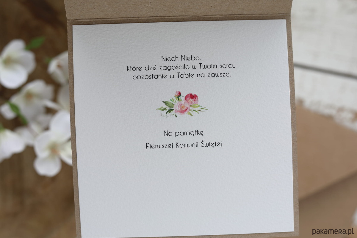 Wyjątkowa kartka na komunię wykonana jest z papieru kraftowego oraz papieru bawełnianego w odcieniu śmietanki z użyciem ozdoby tekturkowej. Kartka otwierana do góry, w środku wklejona jest kartka z papieru bawełnianego - gotowe wyjątkowe życzenia są już w środku (brak możliwości zmiany). W zestawie z kopertą.