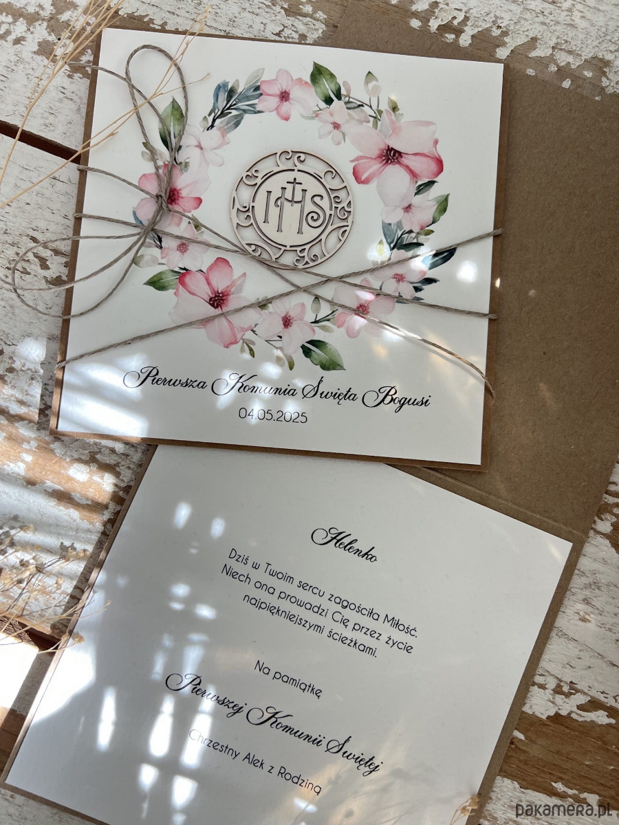 Wyjątkowa rustykalna kartka na komunię wykonana na bazie papieru kraftowego z użyciem starannie wyselekcjonowanego papieru bawełnianego w kolorze ecri oraz tekturkowej ozdoby. Kartka otwierana jest do góry. Przewiązana jest lnianym sznureczkiem. W zestawie brązowa koperta.