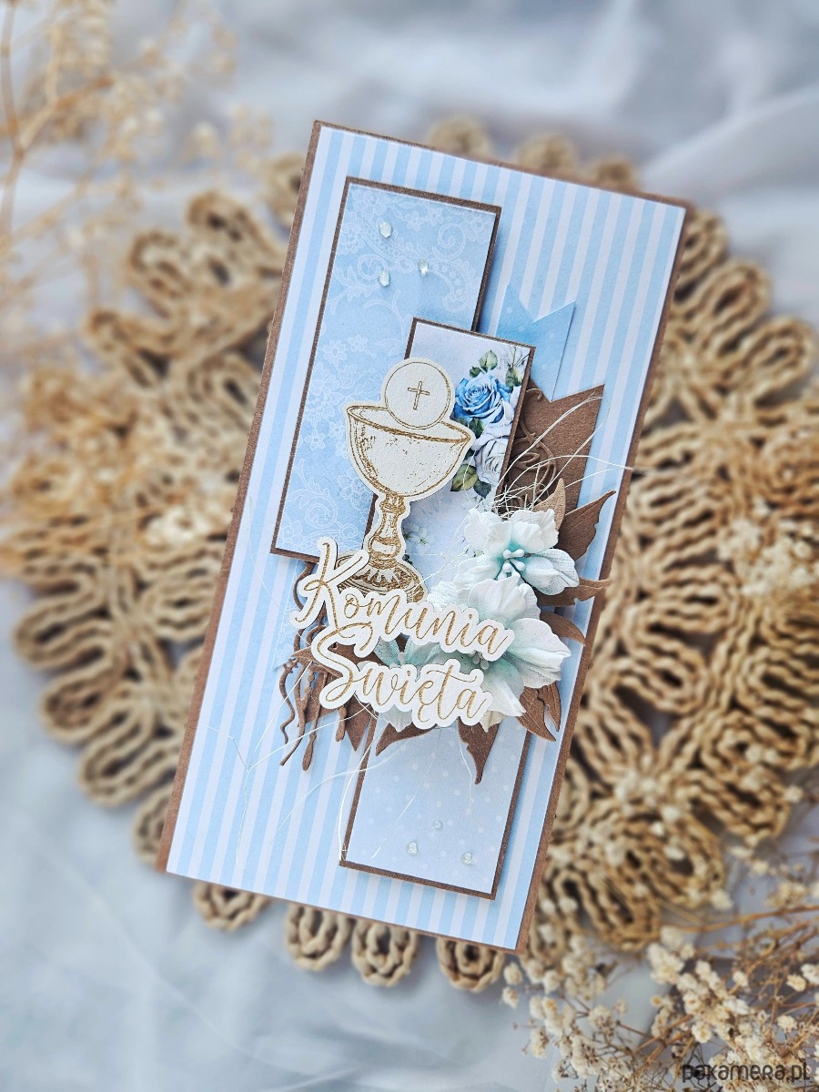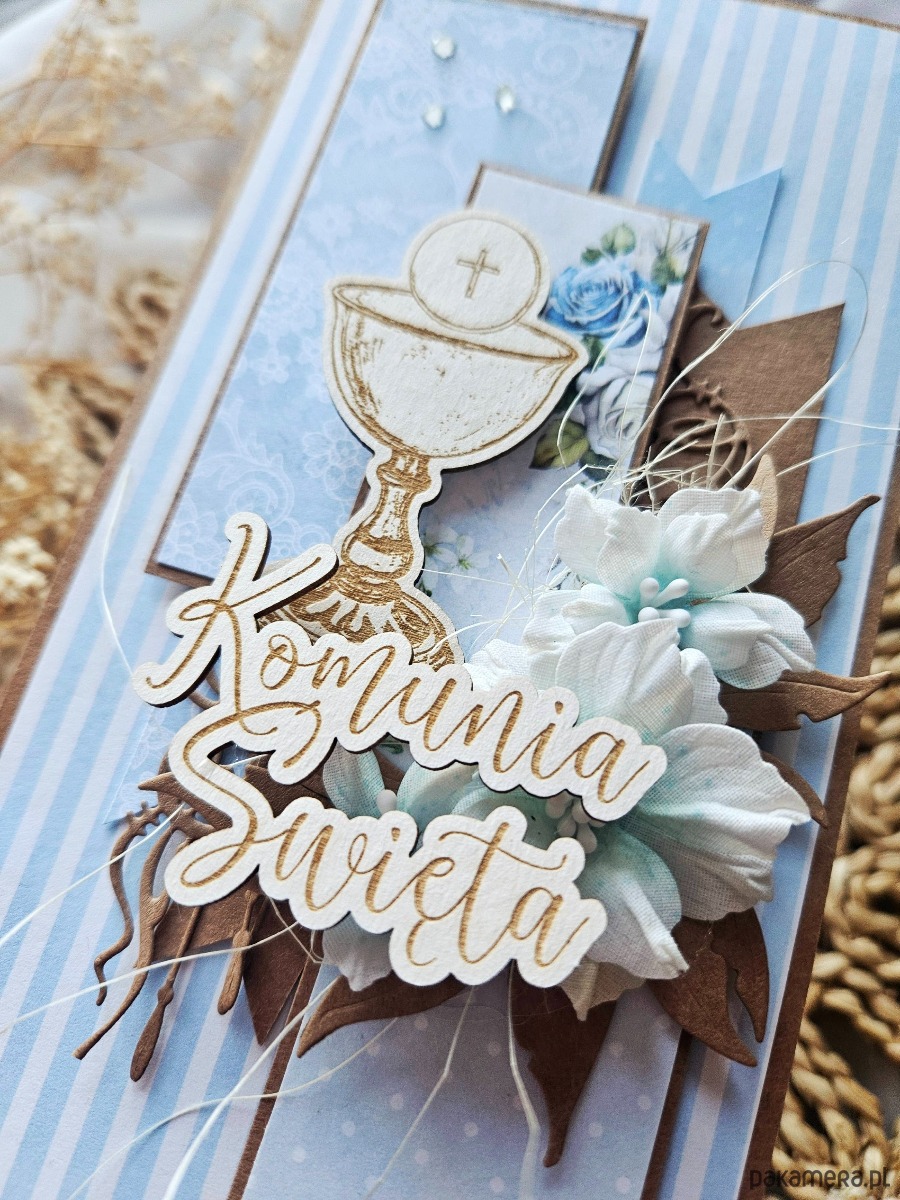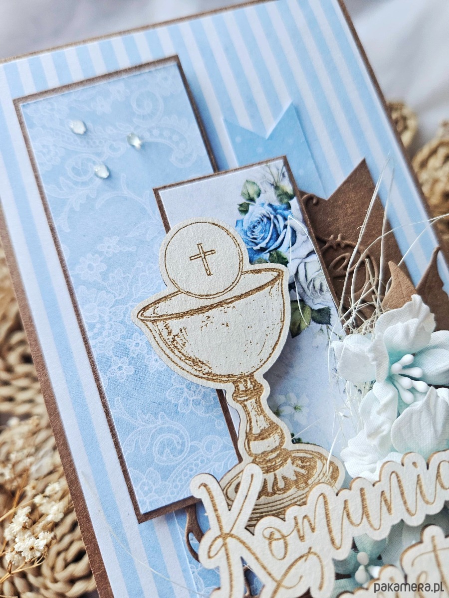Kartka oklejona papierami z nadrukiem w kolorze niebieskim. Na froncie kielich z hostią na drewienku oraz napis podniesiony na folii.