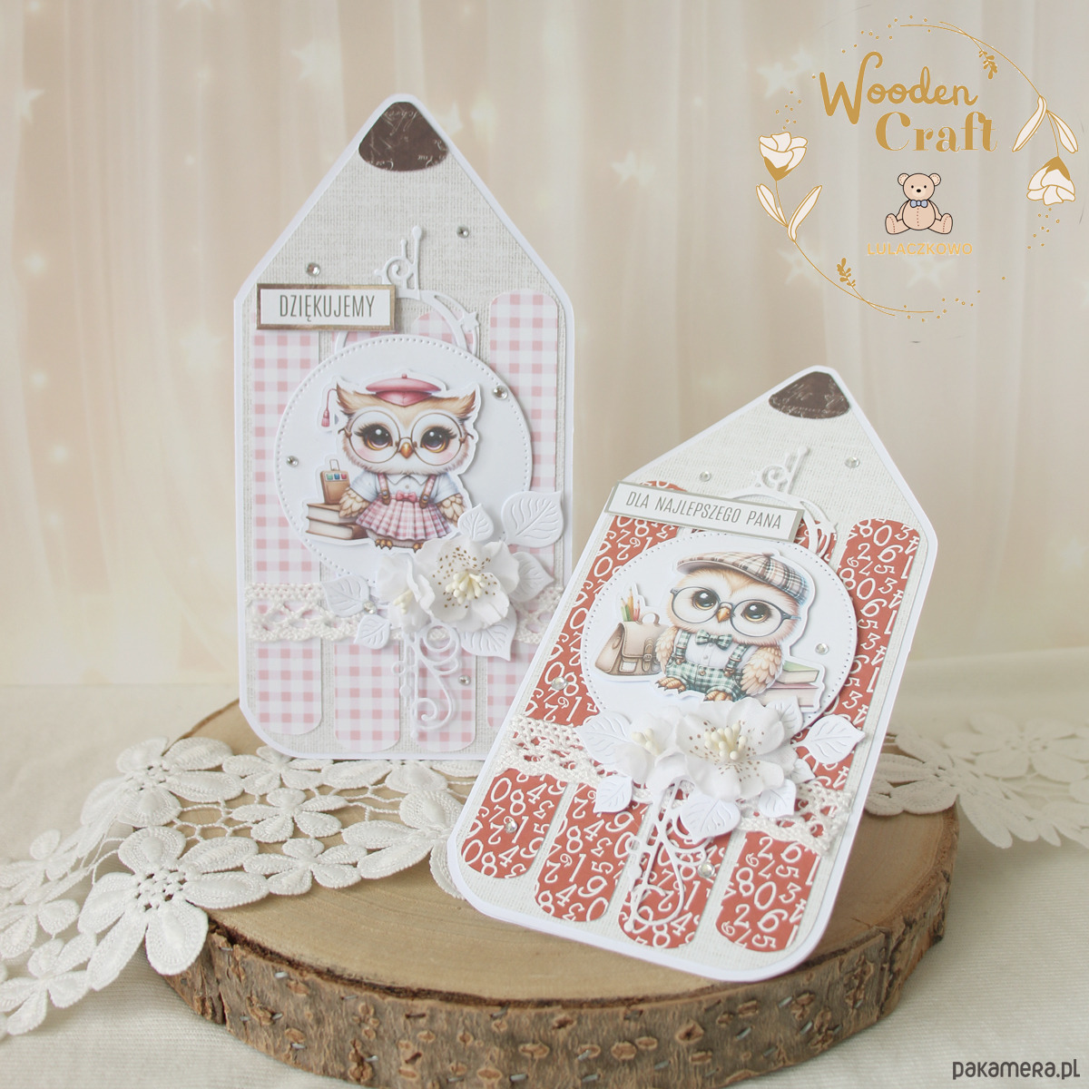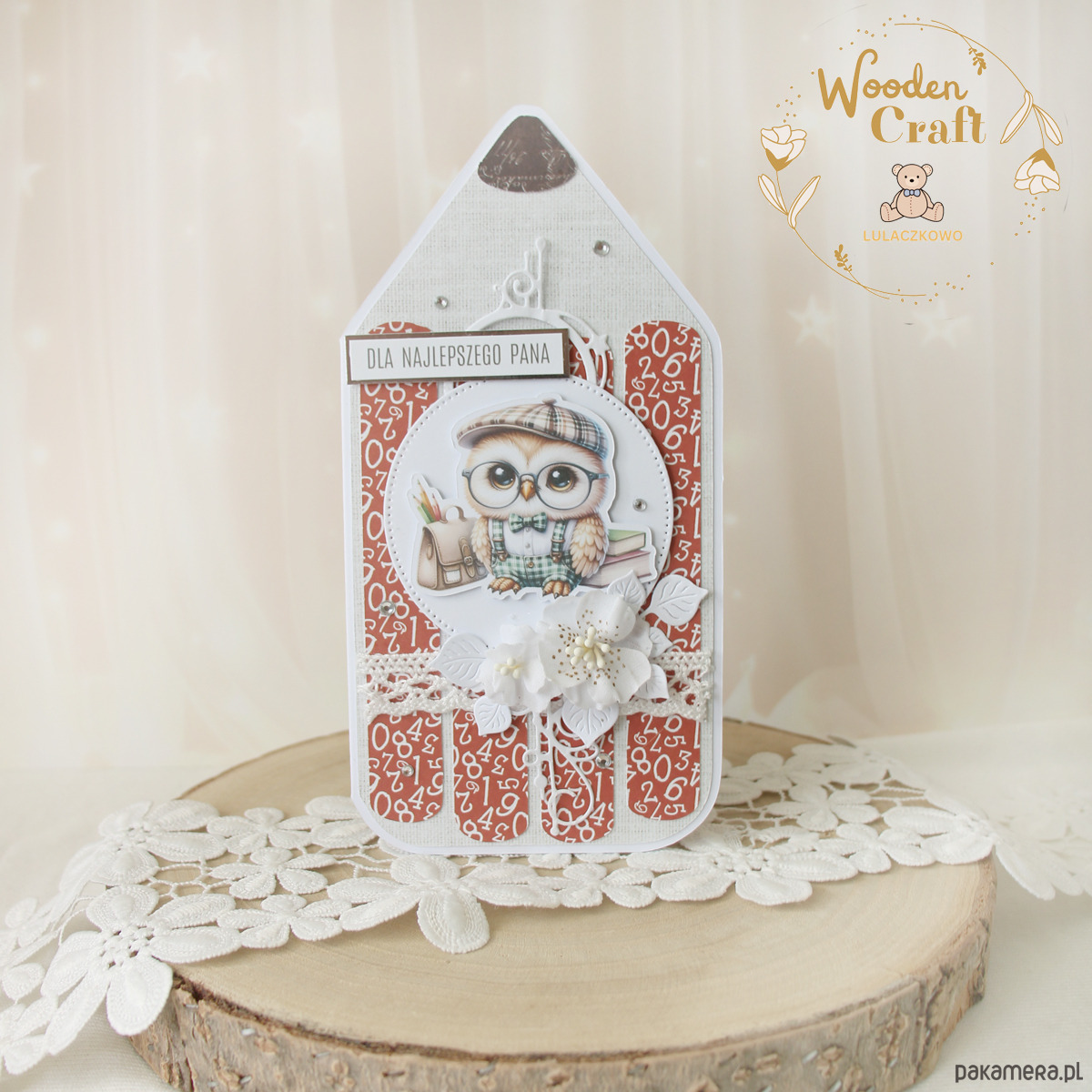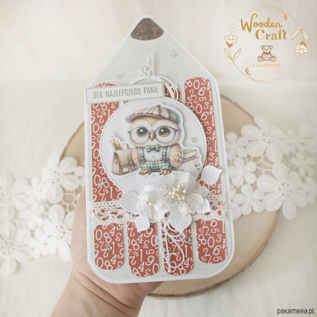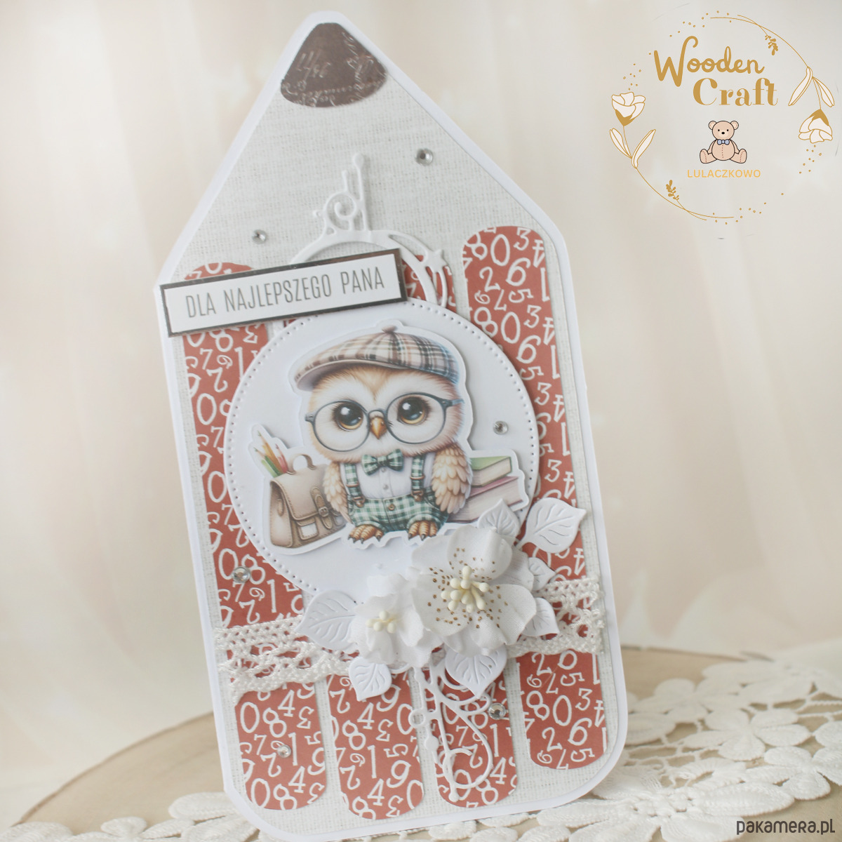 Przepiękna, ręcznie robiona kartka w kształcie kredki, jako podziękowanie na zakończenie roku szkolnego dla nauczyciela lub wychowawcy. Kartka z motywem uroczej sowy z torbą i książkami, ozdobiona koronką, ażurowym dekorem, kryształkami oraz ręcznie robionymi, materiałowymi kwiatami, a także napisem "Dla Najlepszego Pana" (na życzenie mogę zmienić napis na dowolny). Kartka w odcieniach przepięknej czerwieni i beżu, otwierana, w środku jest pusta, z miejscem na podpisy uczniów i życzenia (istnieje możliwość personalizacji, wklejenia imienia nauczycielki, wychowawczyni oraz własnej dedykacji/życzeń), w tym celu proszę o kontakt.