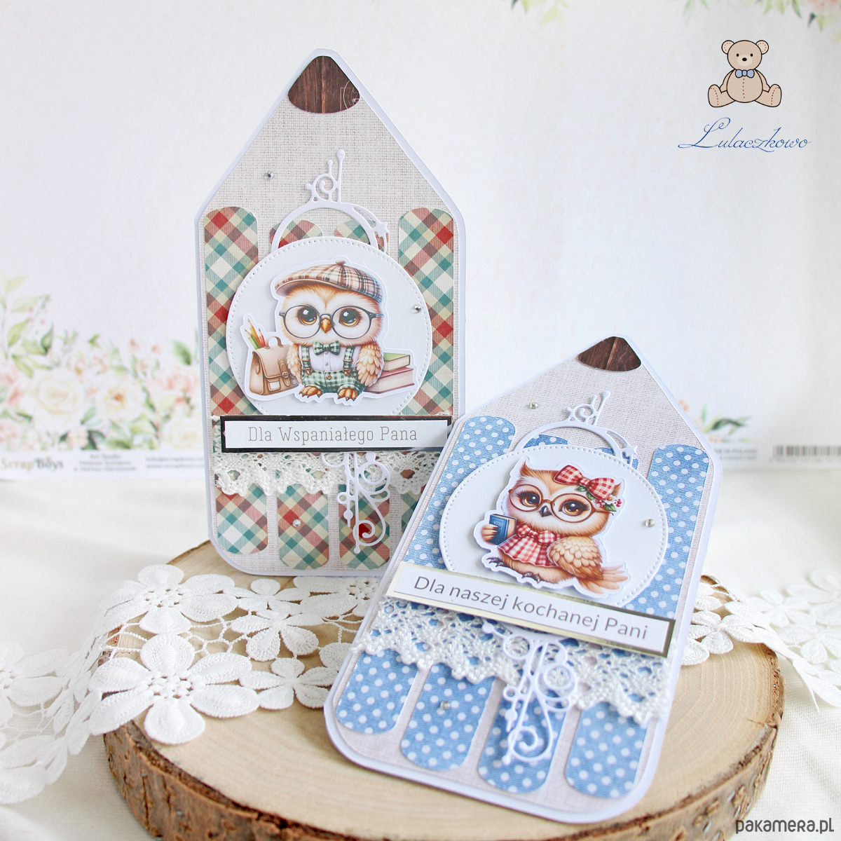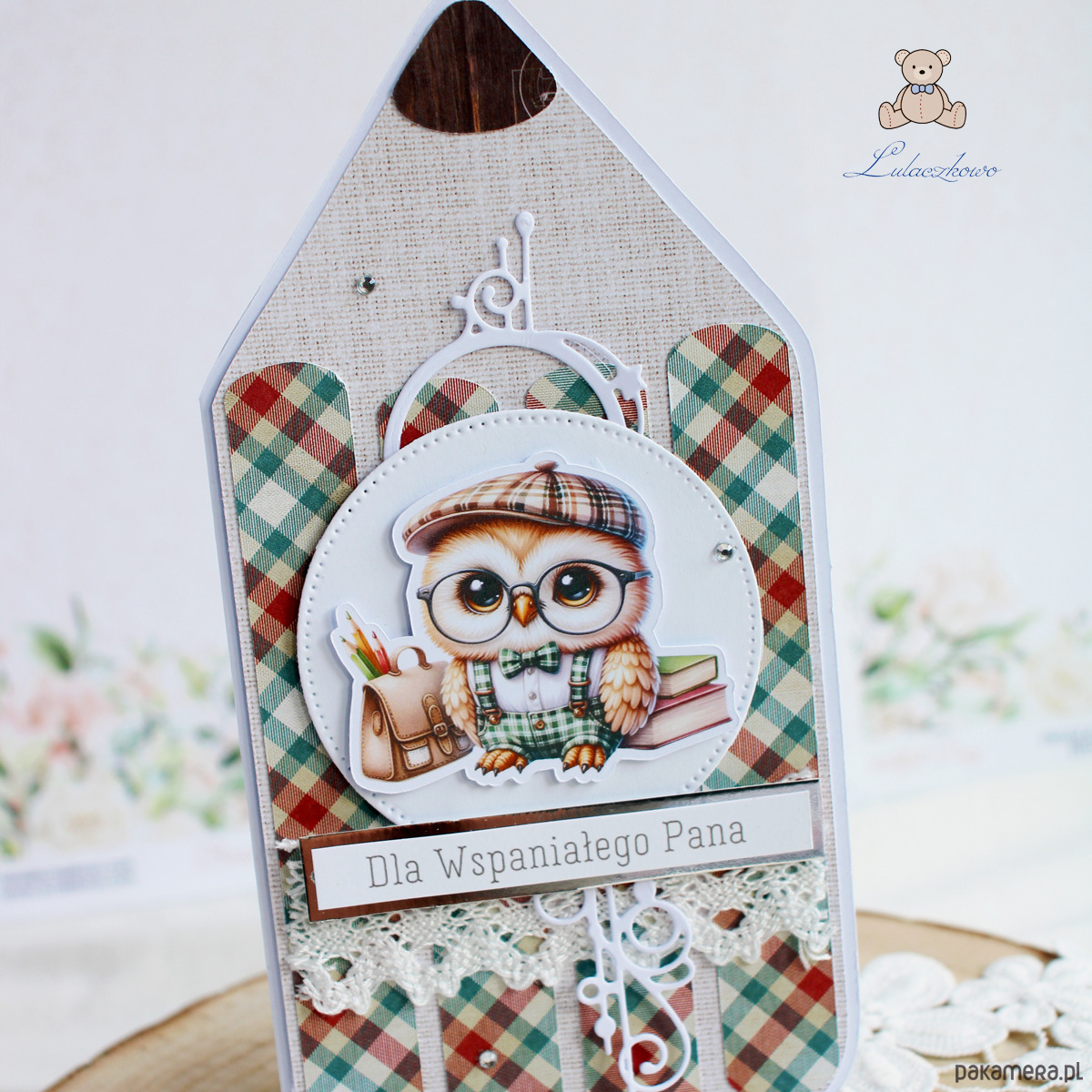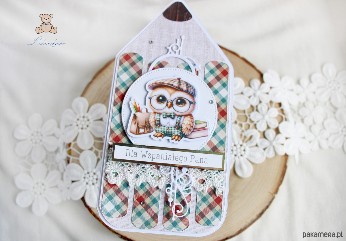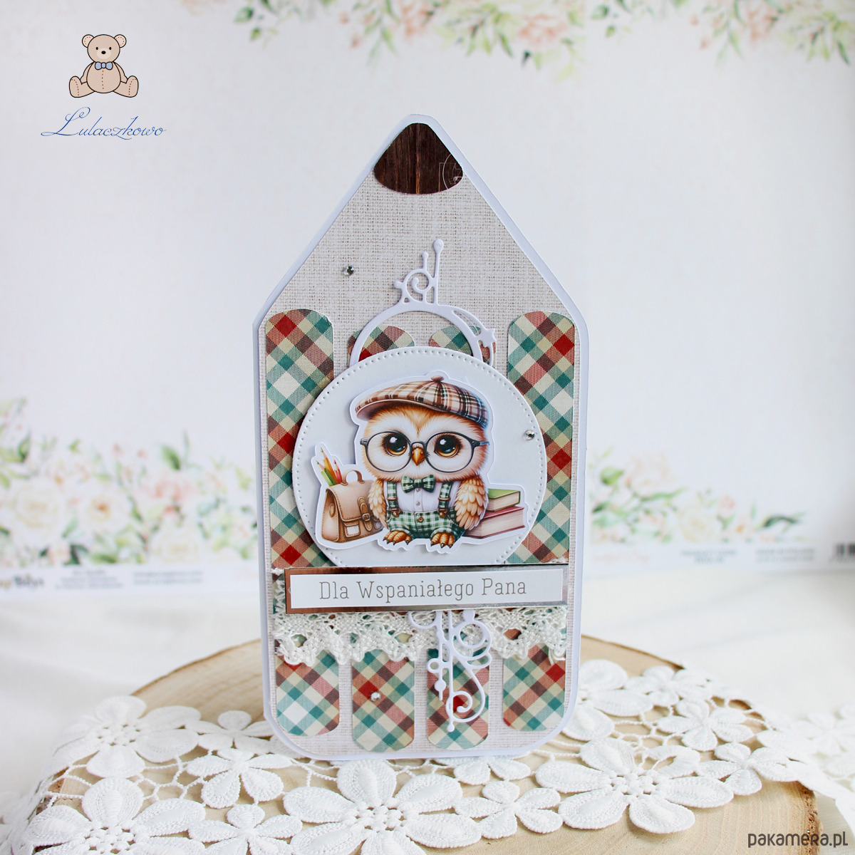 Przepiękna, ręcznie robiona kartka w kształcie kredki, jako podziękowanie na zakończenie roku szkolnego dla nauczyciela lub wychowawcy. Kartka z motywem uroczej sowy w berecie z książkami i torbą, ozdobiona koronką, ażurowym dekorem, kryształkami, a także napisem "Dla wspaniałego Pana" (na życzenie mogę zmienić napis na dowolny). Kartka w krateczkowy deseń, otwierana, w środku jest pusta, z miejscem na podpisy uczniów i życzenia (istnieje możliwość personalizacji, wklejenia imienia nauczycielki, wychowawczyni oraz własnej dedykacji/życzeń), w tym celu proszę o kontakt.