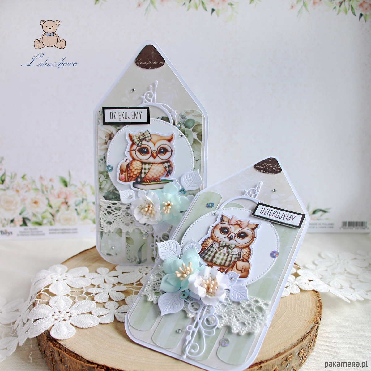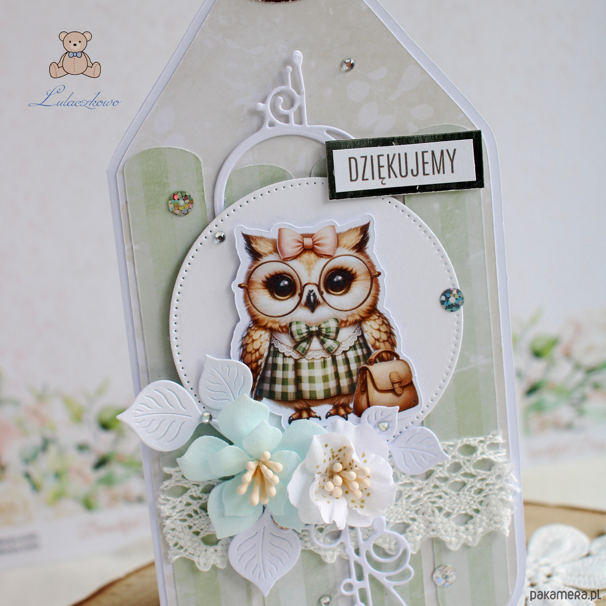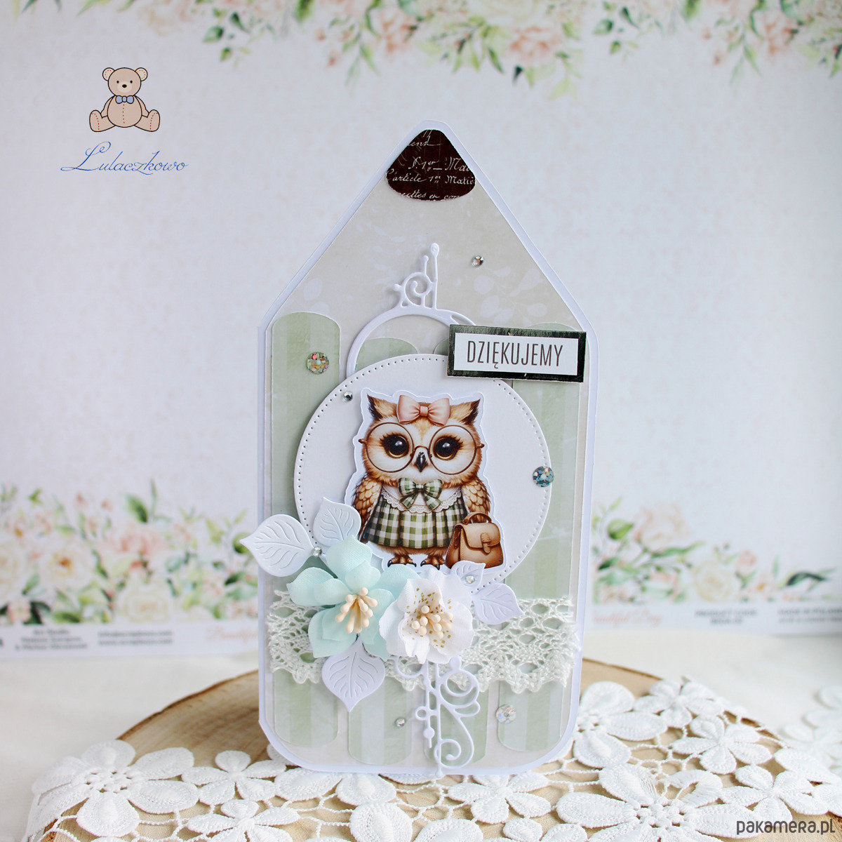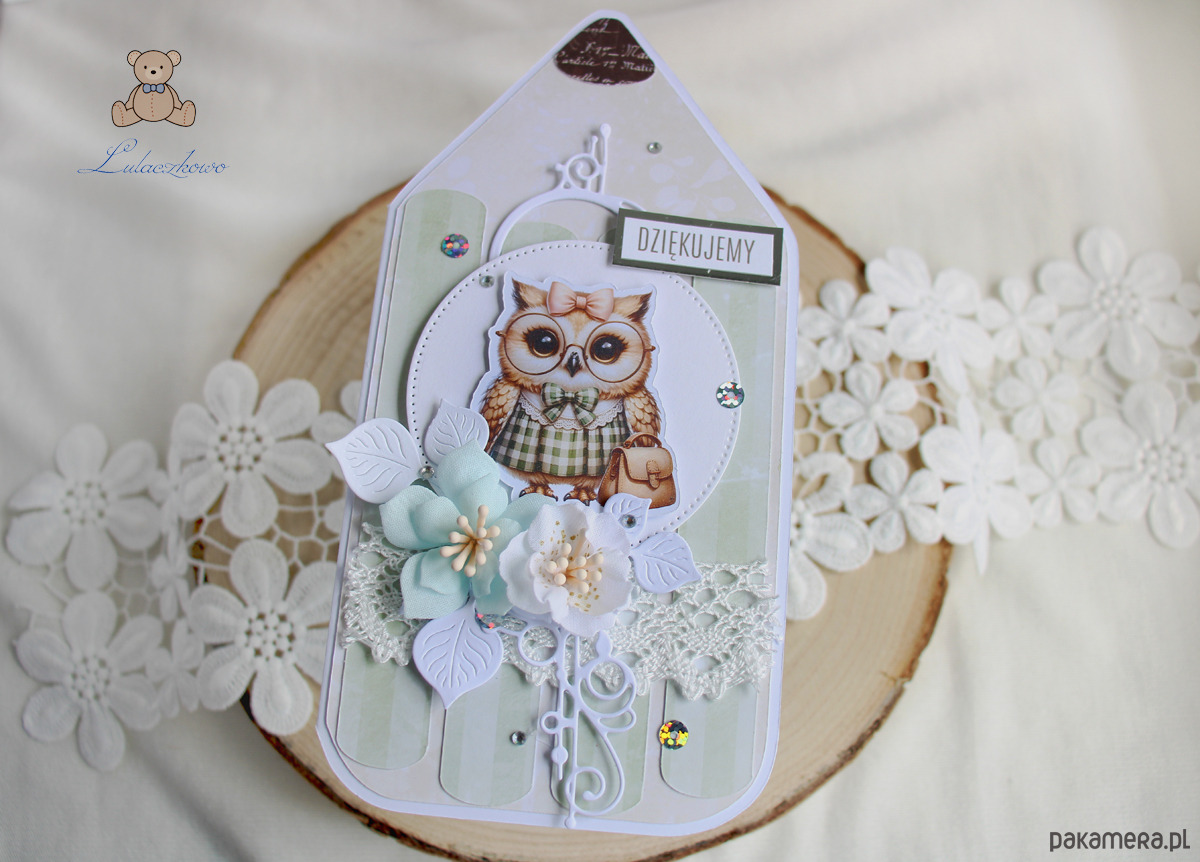 Przepiękna, ręcznie robiona kartka w kształcie kredki, jako podziękowanie na zakończenie roku szkolnego dla nauczyciela lub wychowawcy. Kartka z motywem uroczej sowy z książką, ozdobiona koronką, ażurowym dekorem, kryształkami oraz ręcznie robionymi, materiałowymi kwiatami, a także napisem "Dziękujemy" (na życzenie mogę zmienić napis na dowolny). Kartka w odcieniach przepięknej miętowej zieleni i beżu, otwierana, w środku jest pusta, z miejscem na podpisy uczniów i życzenia (istnieje możliwość personalizacji, wklejenia imienia nauczycielki, wychowawczyni oraz własnej dedykacji/życzeń), w tym celu proszę o kontakt.