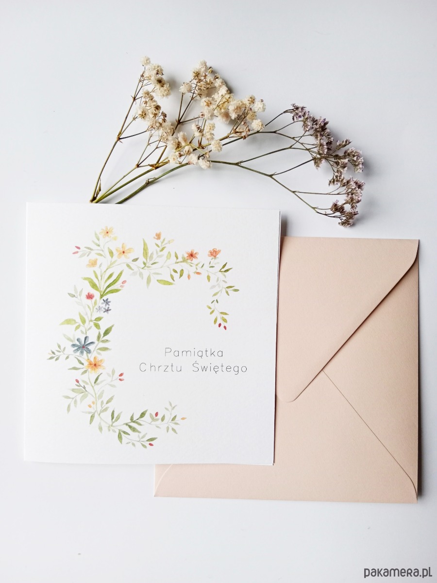 Kartka okolicznościowa na Pamiatkę Chrztu Świętego z autorską ilustracją, pusta w środku