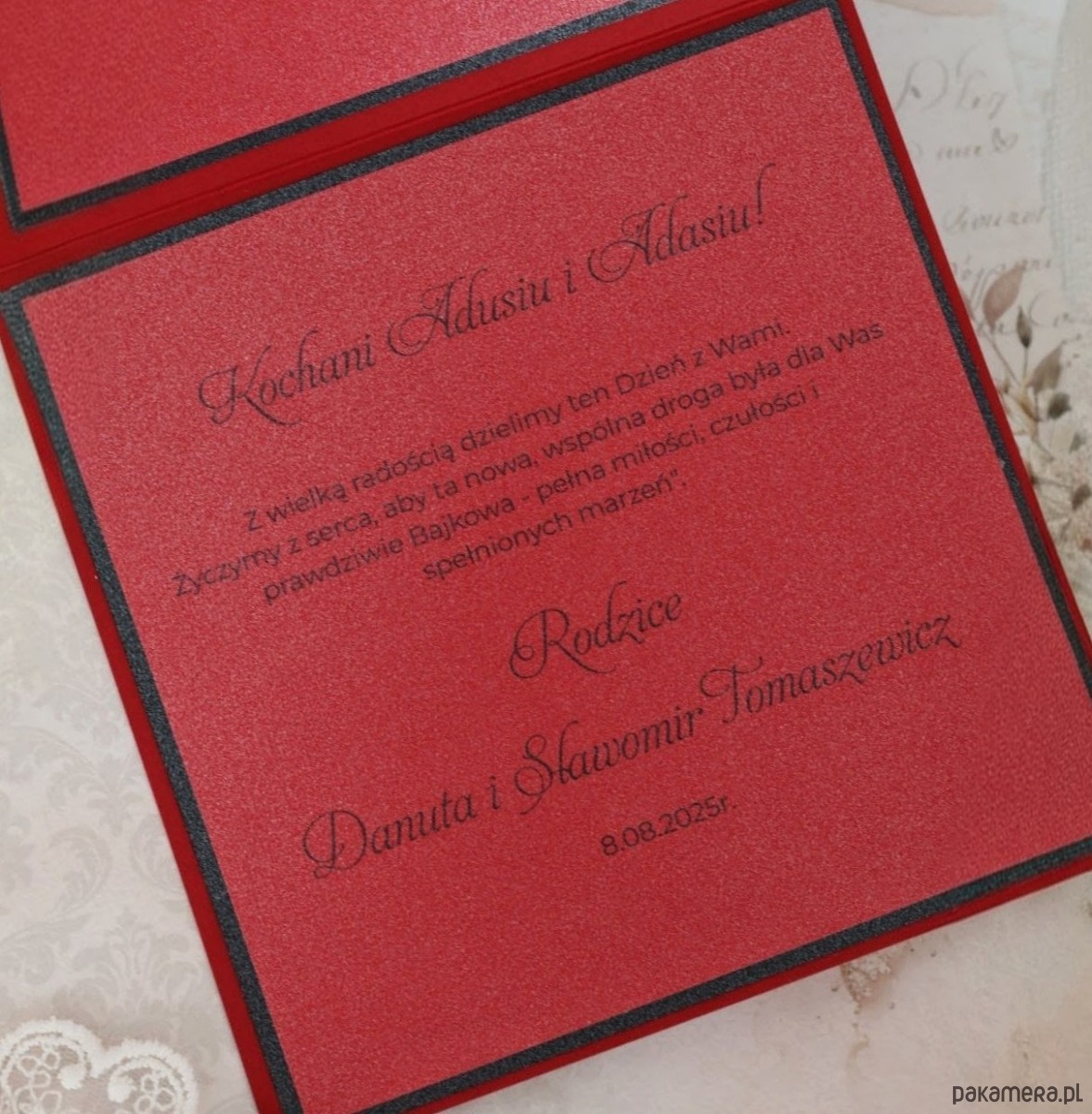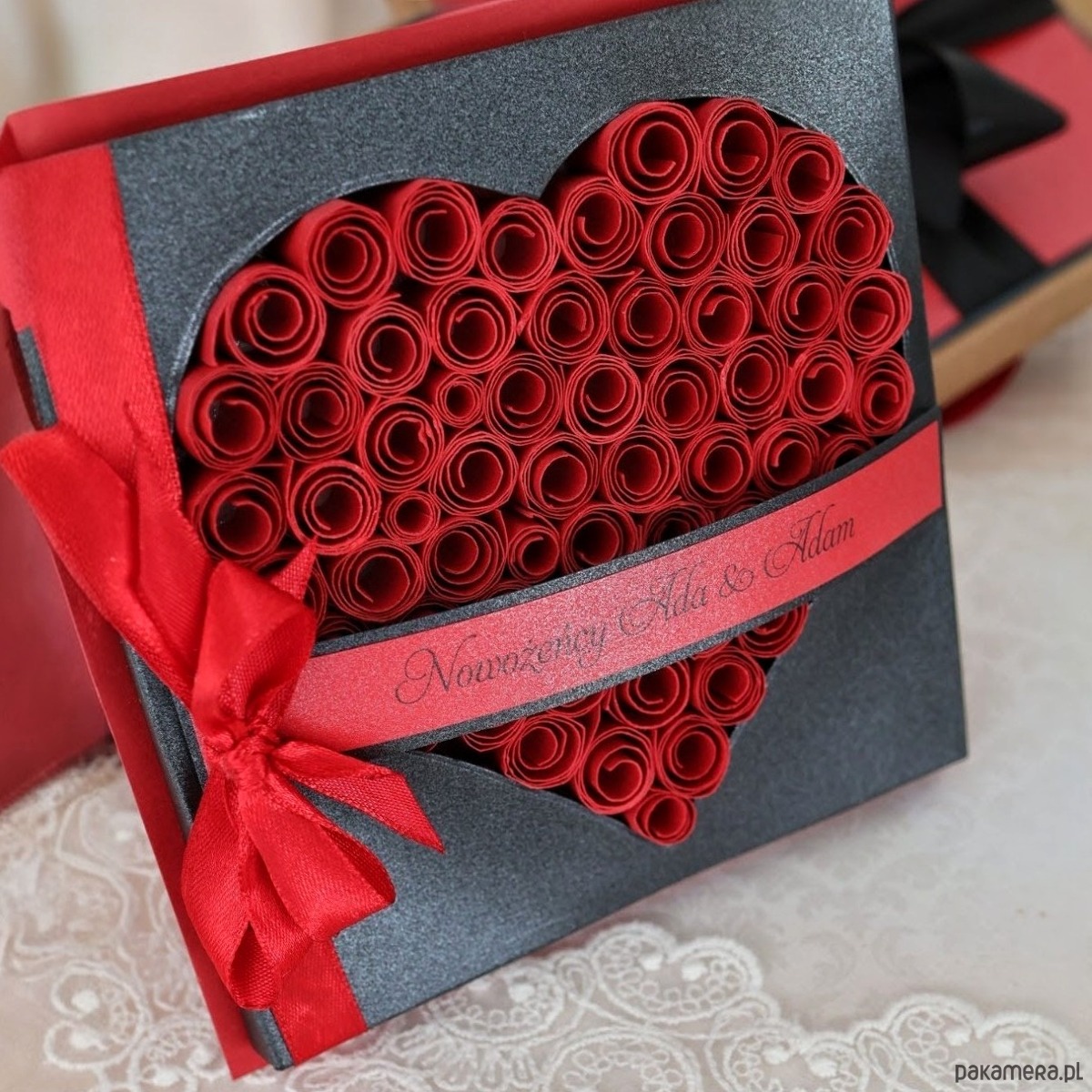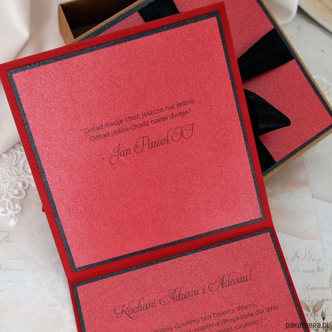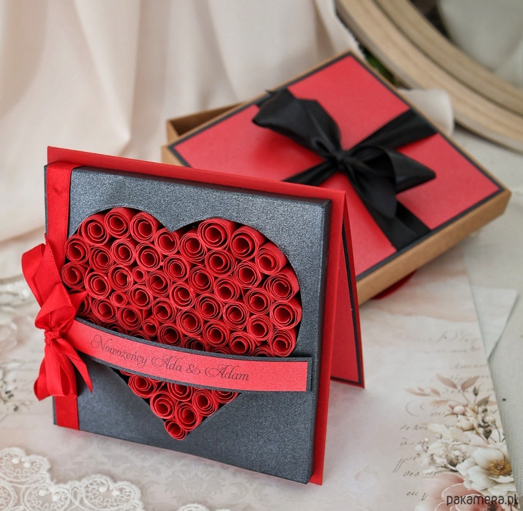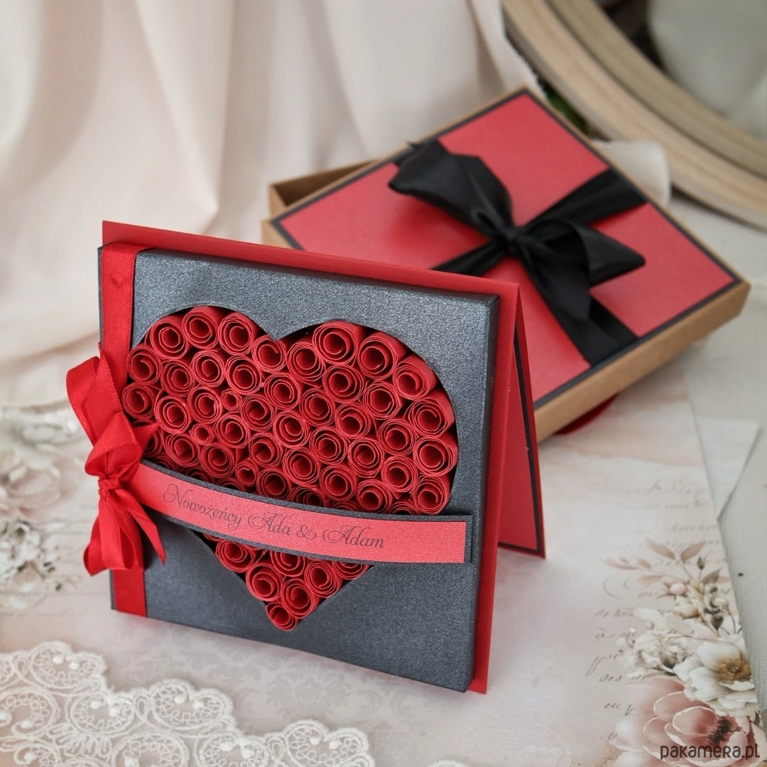 To propozycja dla par, które lubią wyróżniać się i iść własną drogą. Intensywna czerwień połączona z elegancką czernią tworzy wyrazistą, a jednocześnie stylową kompozycję. Na przodzie kartki znajduje się serce wykonane z ręcznie zwijanych ruloników papieru oraz imiona - detal, który przyciąga uwagę i nadaje całości wyjątkowy charakter.