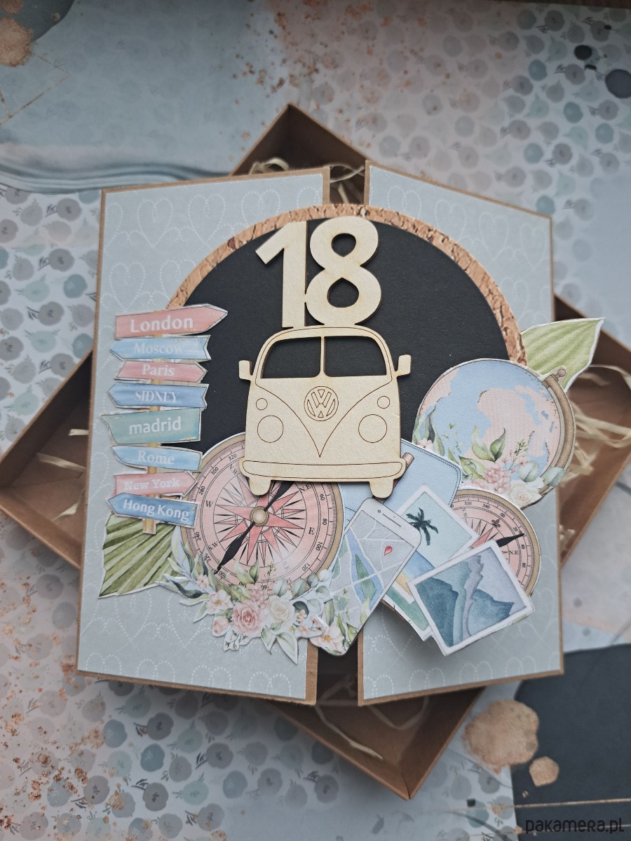 Ręcznie robiona kartka na 18-ste urodziny dla podróżniczki.
