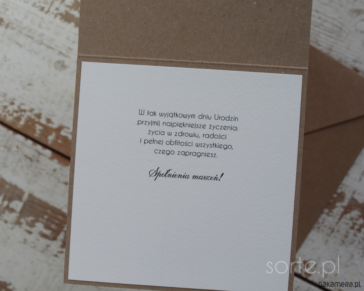 Kartka o wymiarach 14x14 cm wykonana z papieru kraftowego, papieru bawełnianego oraz z najlepszej jakości tekturki. W środku gotowe życzenia. Brak możliwości zmiany.