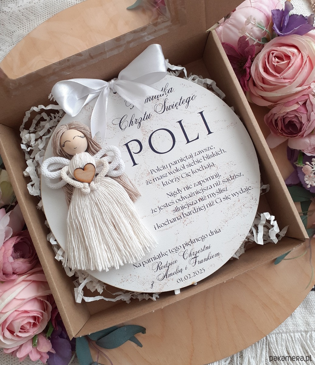 Tabliczka wykonana jest z białej płyty HDF o średnicy 20 cm. Naniesiona jest na niej wysokiej jakości dedykacja wraz z ręcznie plecionym aniołem. Pamiątka jest zapakowana i gotowa do wręczenia jako prezent.