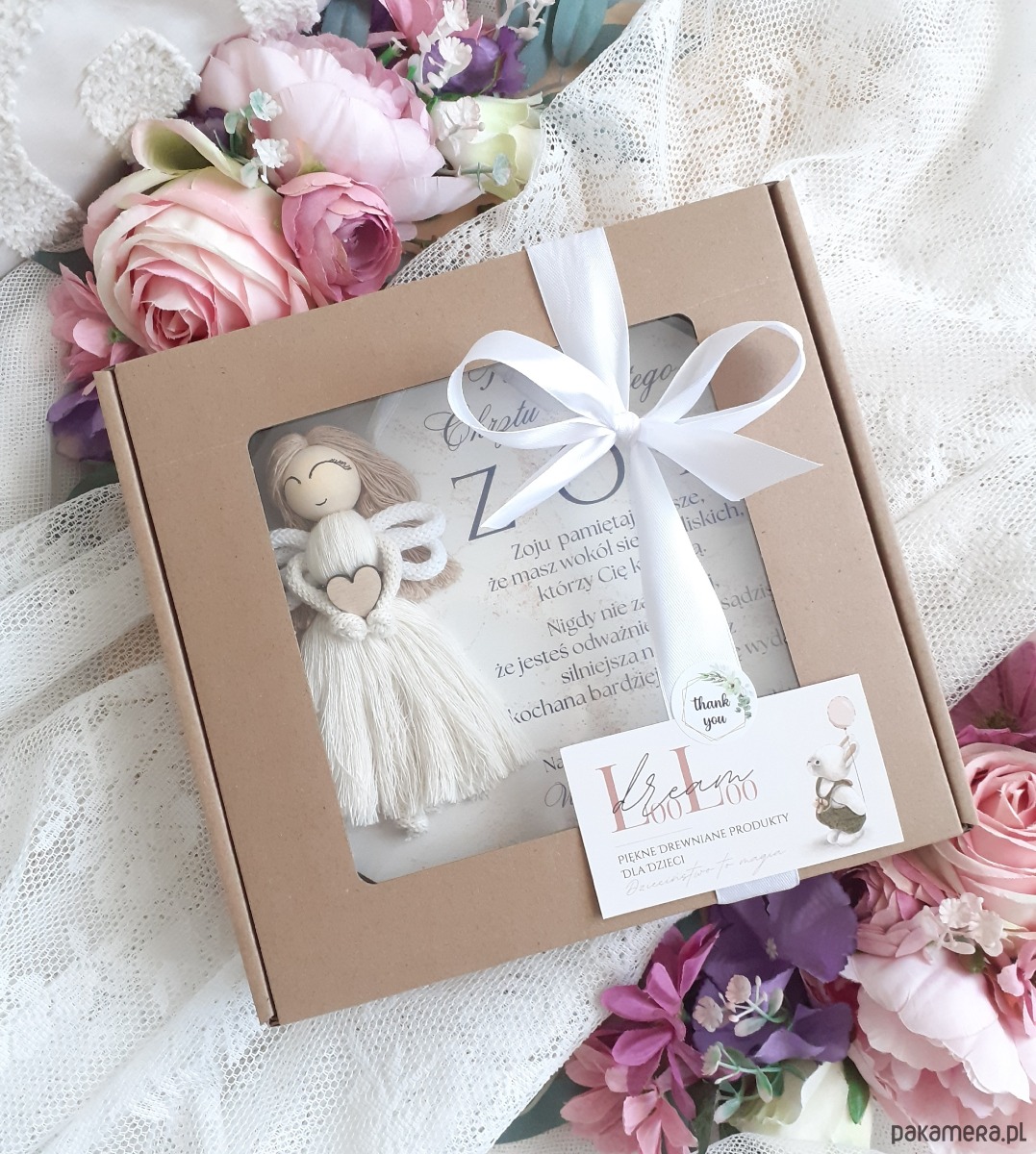 Aniołek wykonany jest z makramy, osadzony na przepięknej, personalizowanej, okrągłej tabliczce. Umieszczona jest na niej również wzruszająca dedykacja wraz z podpisem.