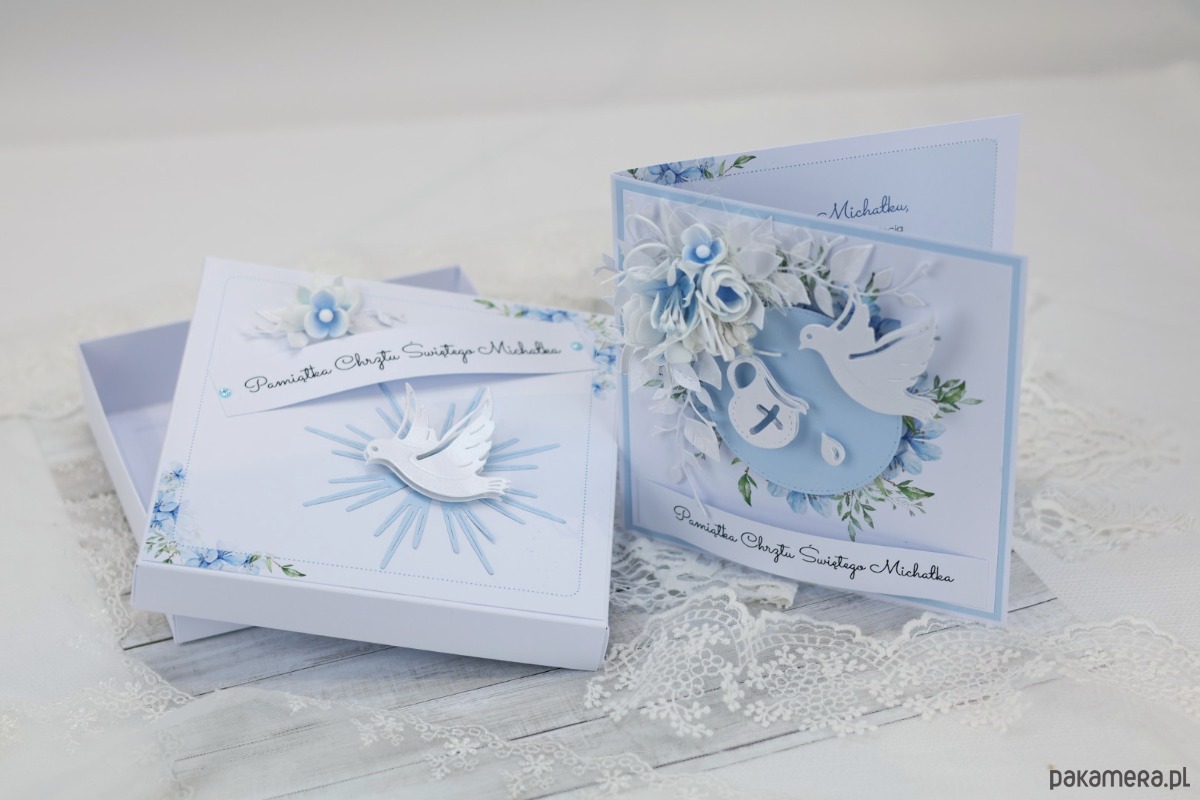 Są prezenty, które mówią „jesteśmy z Wami” bez wielkich słów. Ta błękitna kartka na chrzest powstała właśnie na taką chwilę: delikatna gołębica, kwiatowe akcenty i spokojna paleta, która pięknie wpisuje się w charakter uroczystości. Na przodzie kartki dodam imię dziecka i datę, a w środku wydrukuję Twoje życzenia – od chrzestnych, dziadków lub całej rodziny.