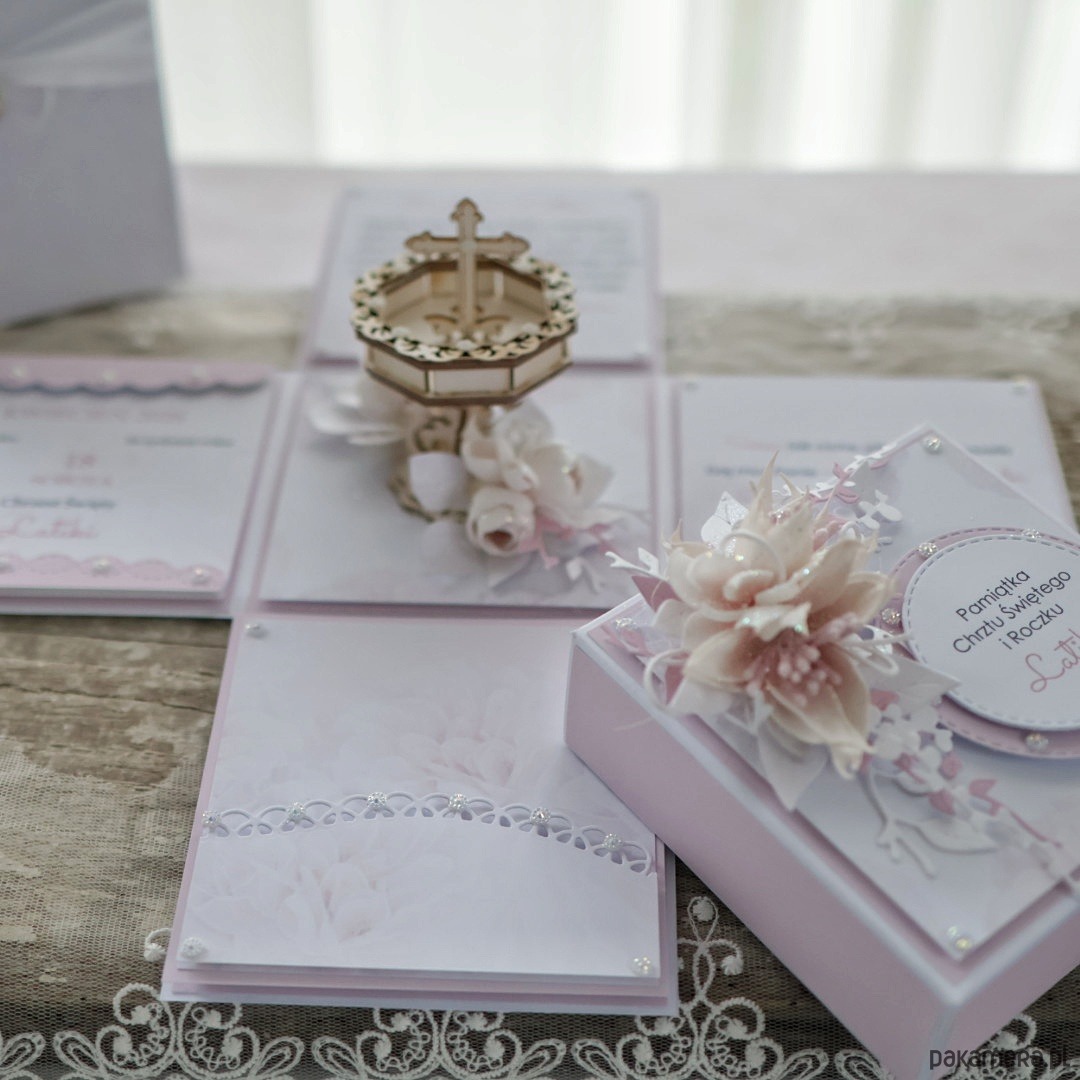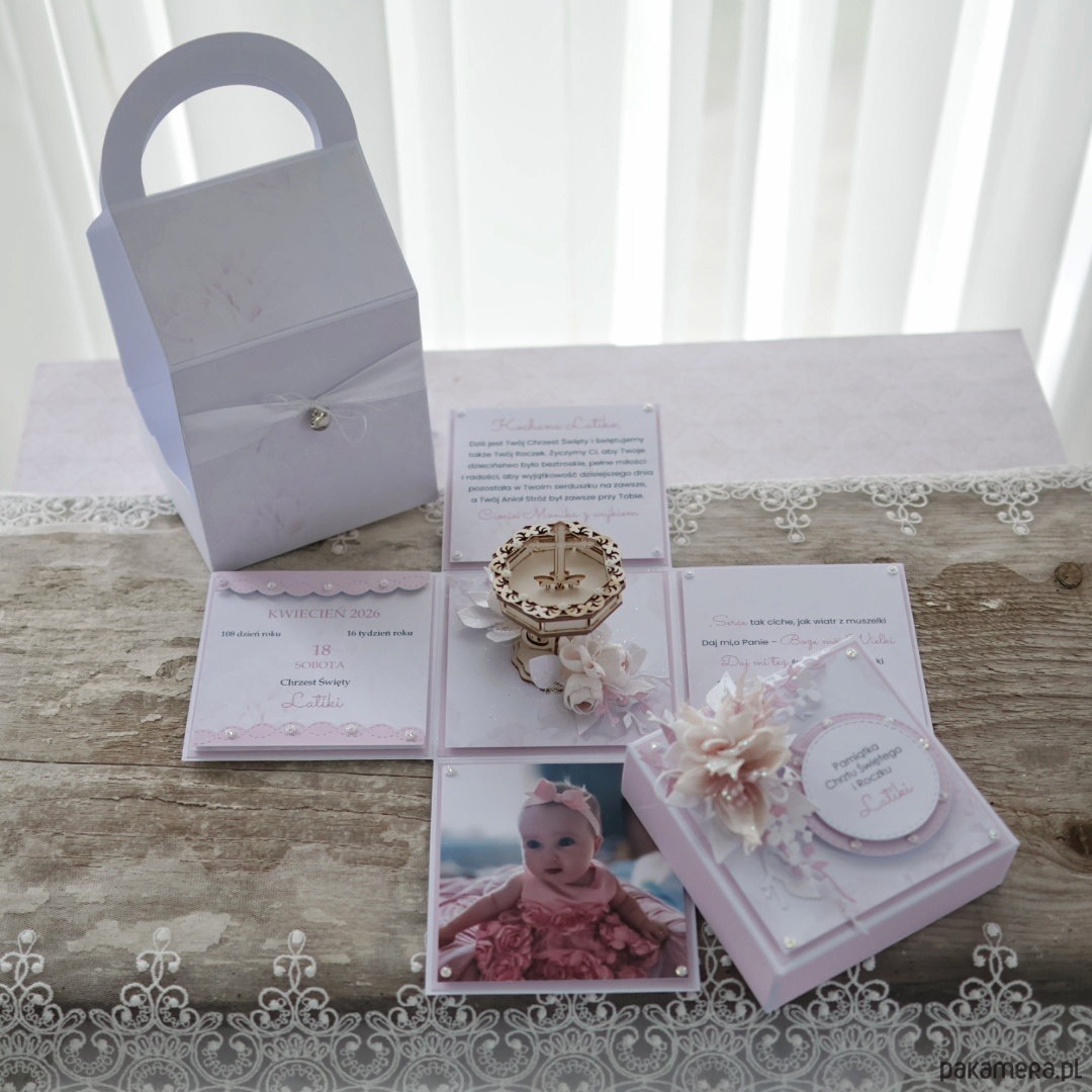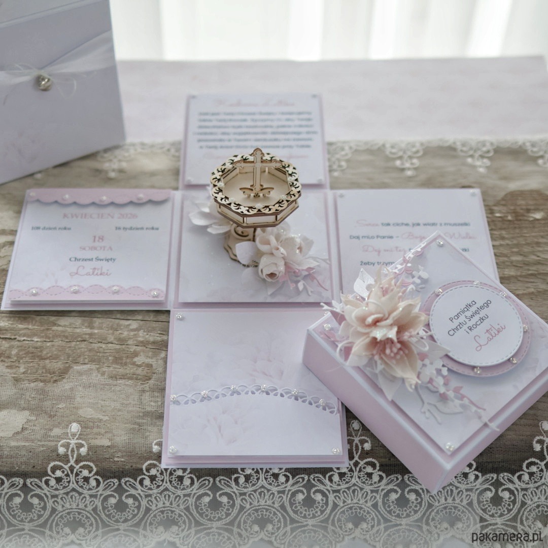 W środku niespodzianka, która pojawia się w momencie otwarcia - chrzcielnica 3D, kwiaty, życzenia, cytat oraz kieszonka na pieniądze, zdjęcie lub kartka z datą Chrztu. W zestawie znajduje się torebka prezentowa dzięki czemu pamiątka jest gotowa do wręczenia.