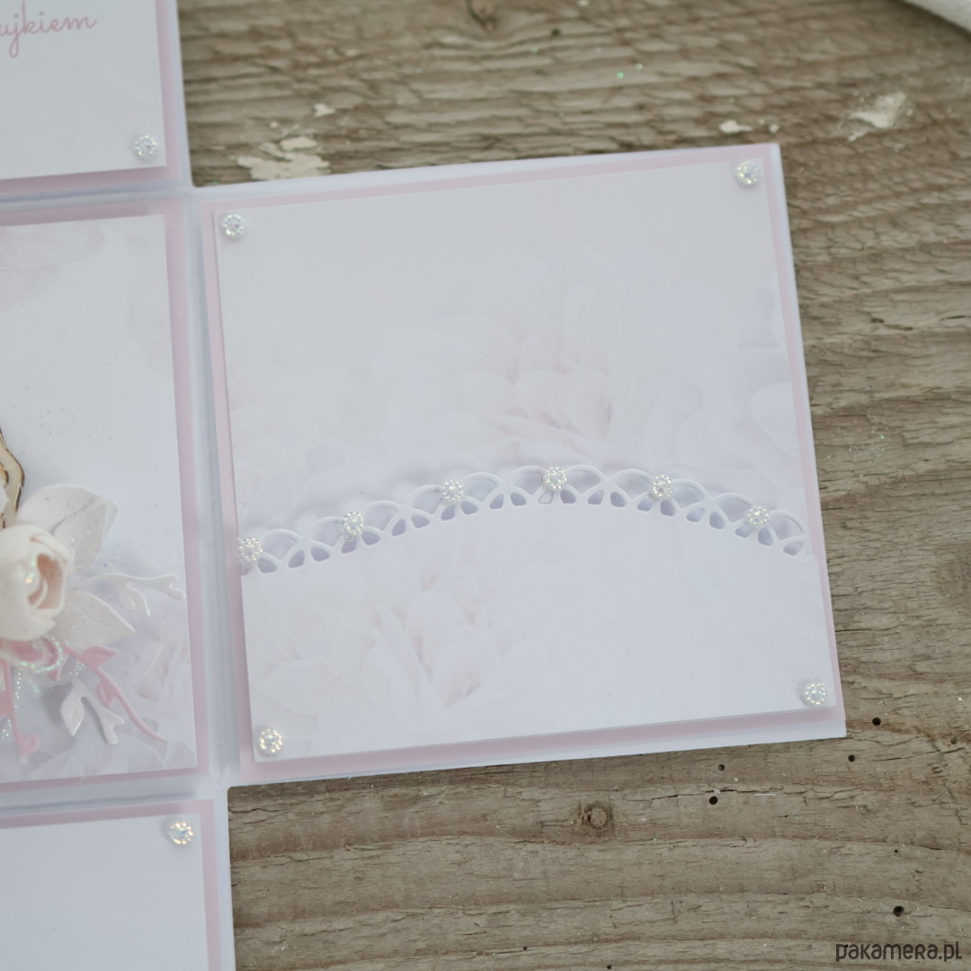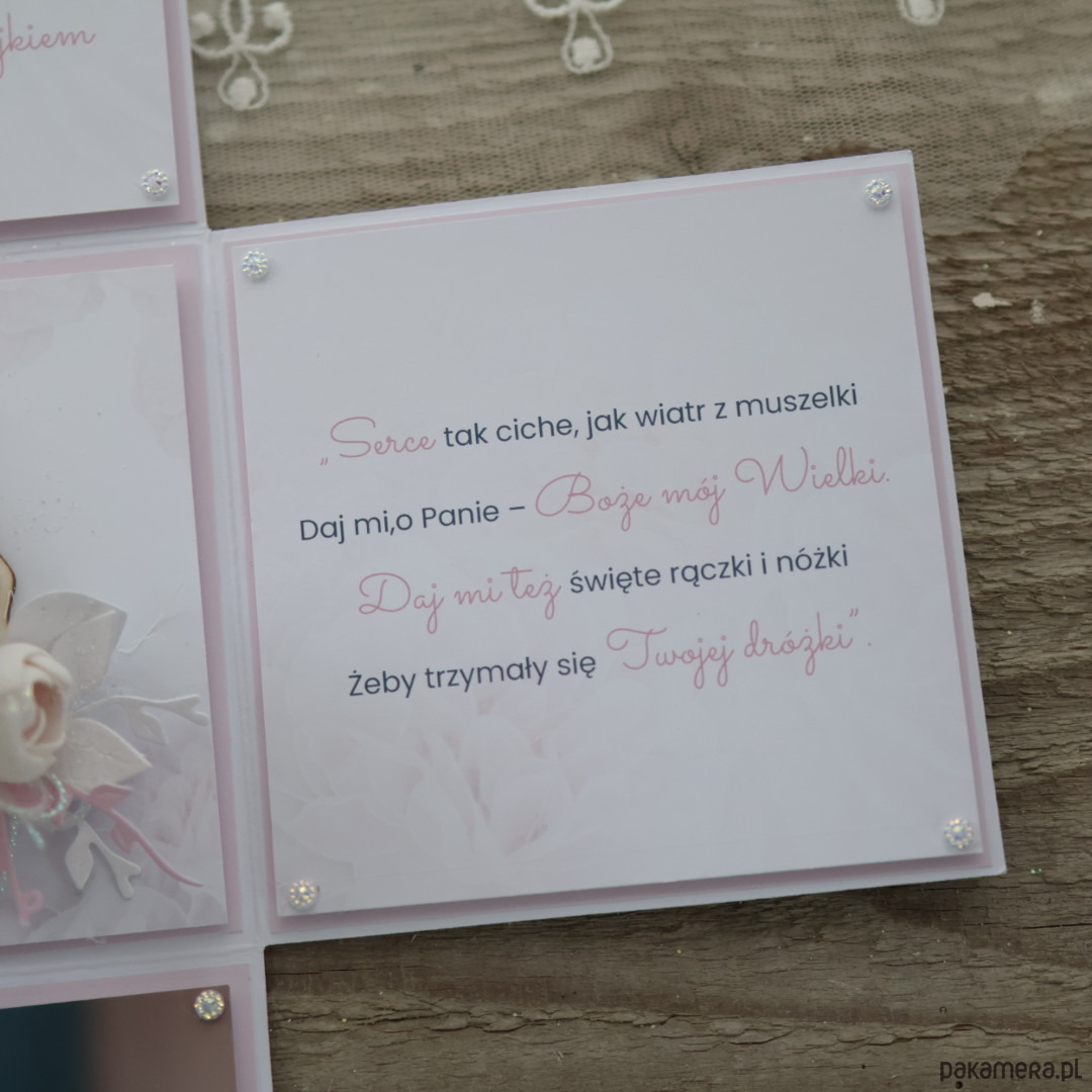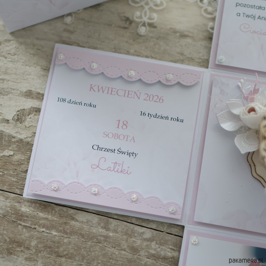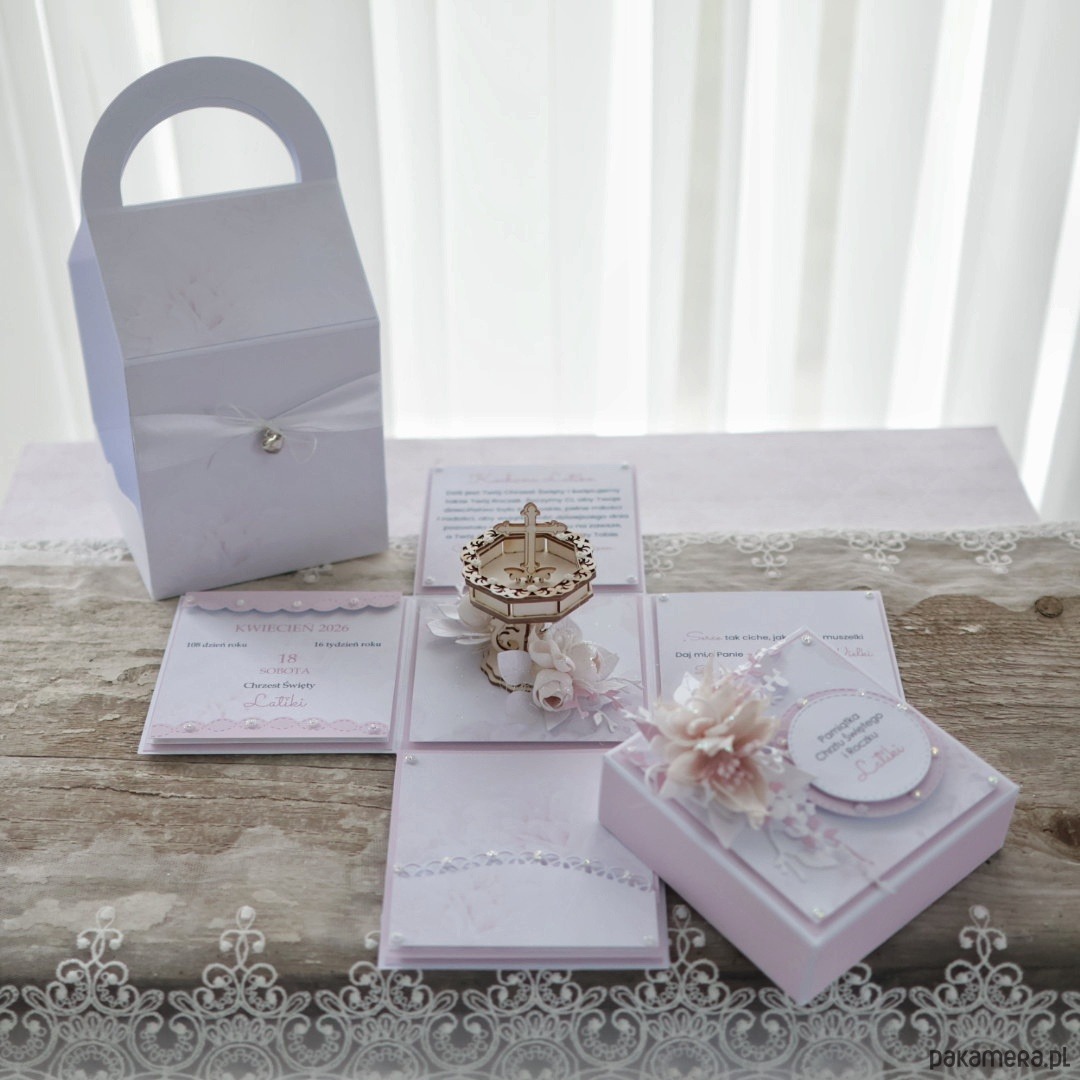 W środku niespodzianka, która pojawia się w momencie otwarcia - chrzcielnica 3D, kwiaty, życzenia, cytat oraz kieszonka na pieniądze, zdjęcie lub kartka z datą Chrztu. W zestawie znajduje się torebka prezentowa dzięki czemu pamiątka jest gotowa do wręczenia.