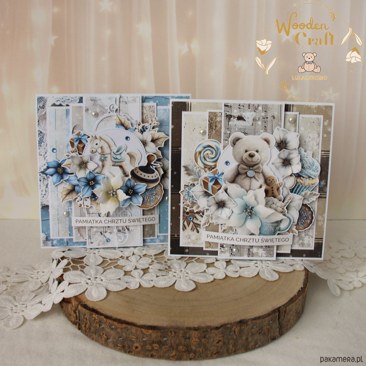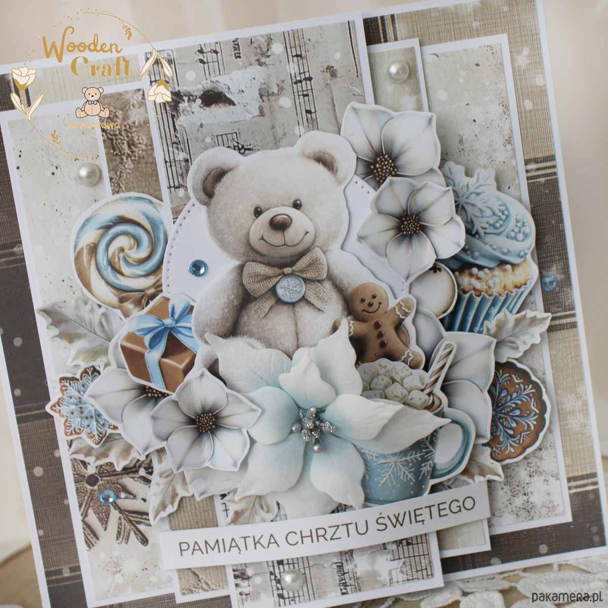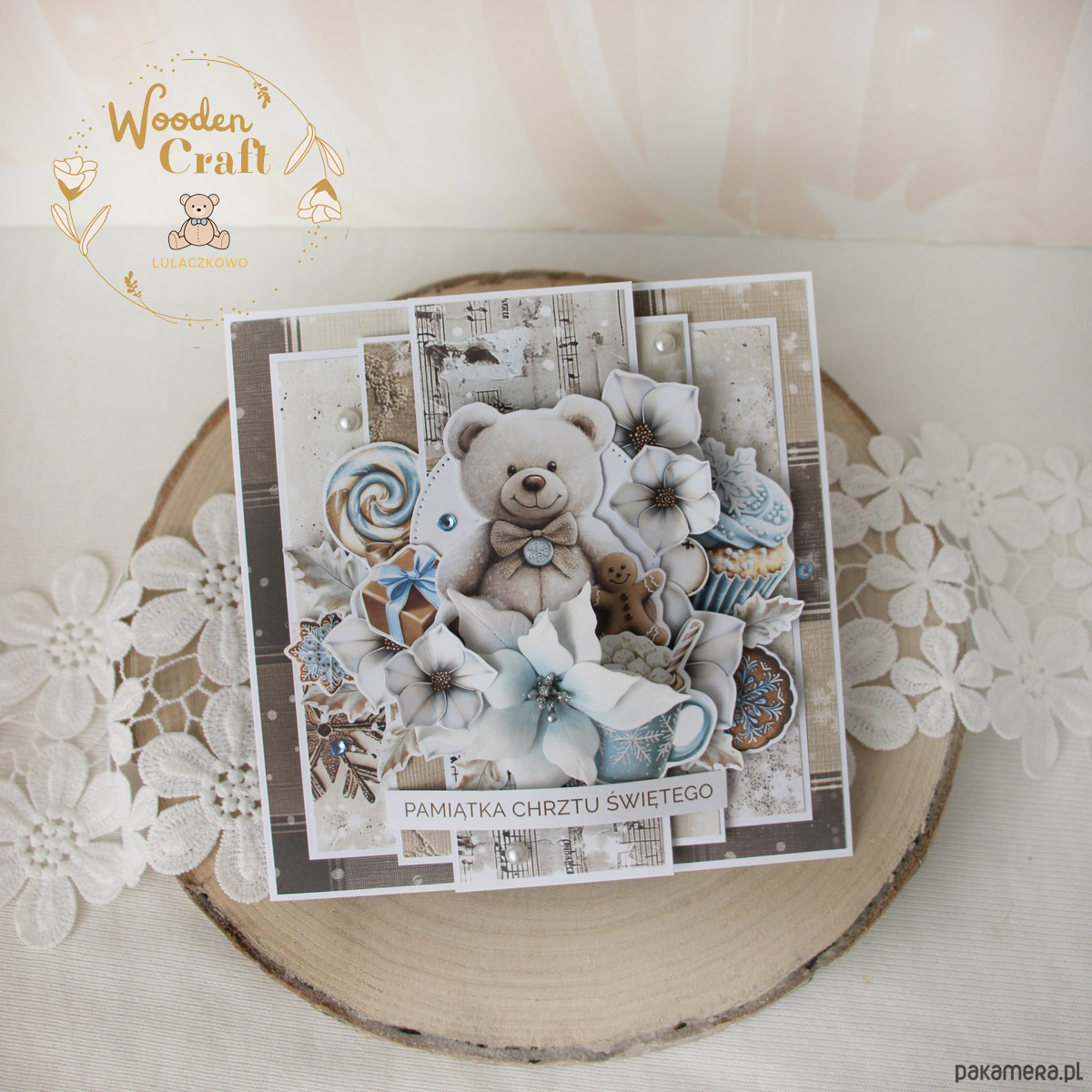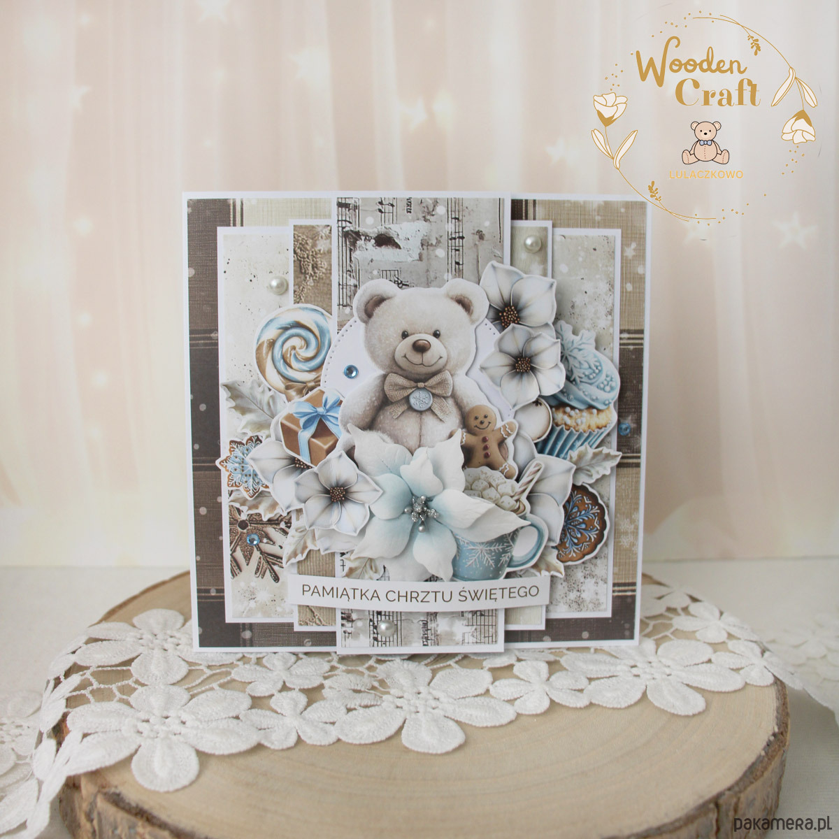 Urocza i nietuzinkowa, warstwowa kartka na chrzest święty dla chłopca, utrzymana w odcieniach brązu, bieli i beżu. Kartka wykonana ręcznie z dbałością o każdy szczegół, z najnowszej kolekcji papierów "Joly Season". Na froncie znajduje się grafika pluszowego misia, ozdobiona kompozycją kwiatową z ręcznie wykonanym kwiatuszkiem, połyskującymi kryształkami i perełkami, a także napisem "Pamiątka Chrztu Świętego" (na życzenie mogę wkleić na kartce również imię dziecka lub całkowicie zmienić napis na inny).