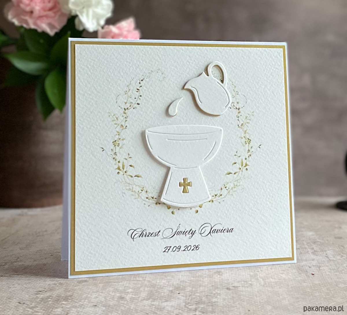 Elegancka, ręcznie robiona, personalizowana kartka z okazji chrztu świętego.