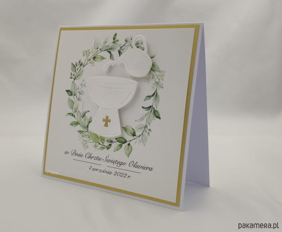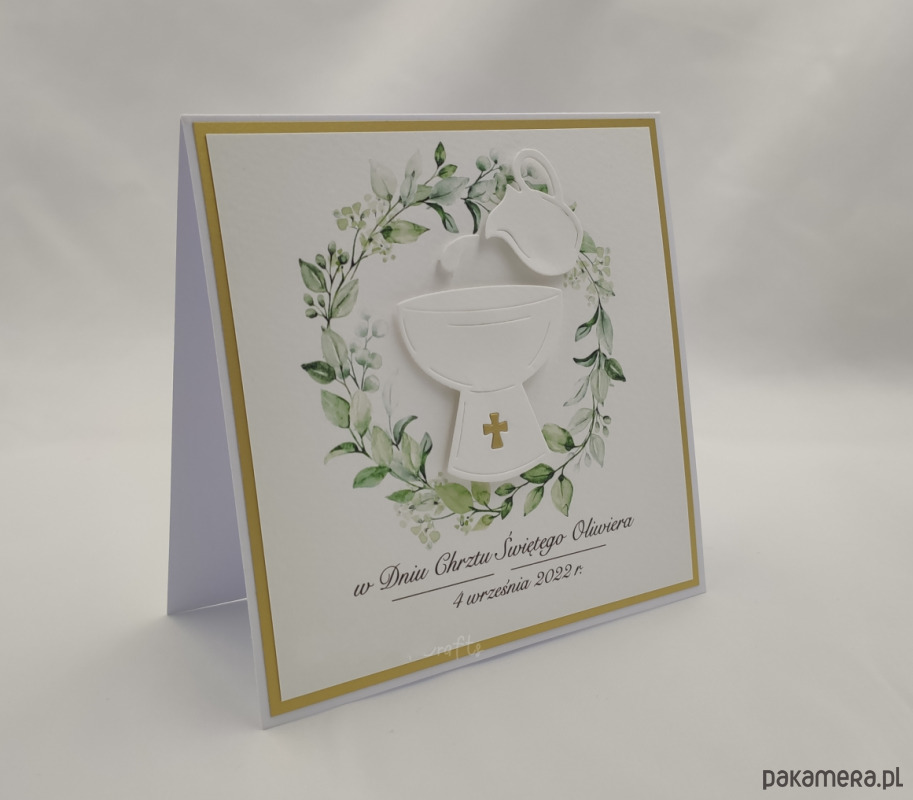 Elegancka, ręcznie wykonana kartka z okazji chrztu w ozdobnej kopercie.