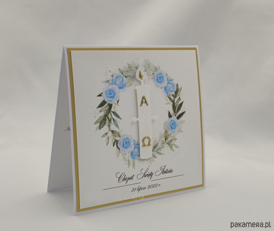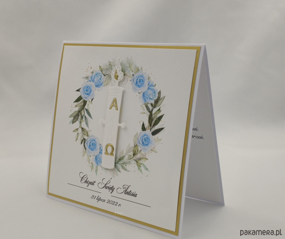 Delikatny zestaw z kwiatową grafiką, ręcznie wyciętym dekorem oraz zdobioną kopertą. Idealna pamiątka dla chłopca.