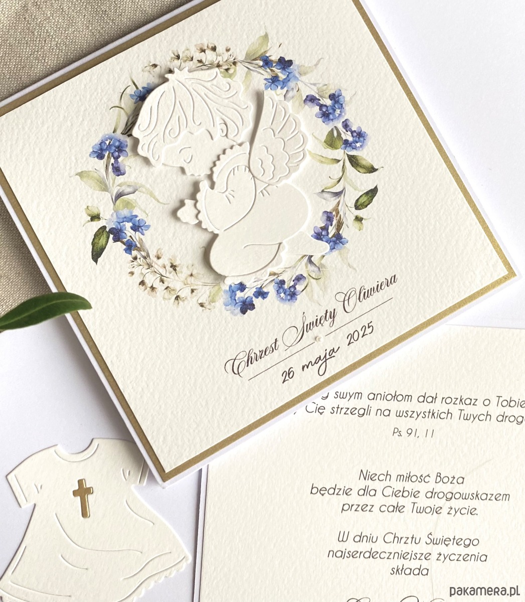 Elegancka, ręcznie wykonana, personalizowana kartka z okazji chrztu w ozdobnej kopercie.