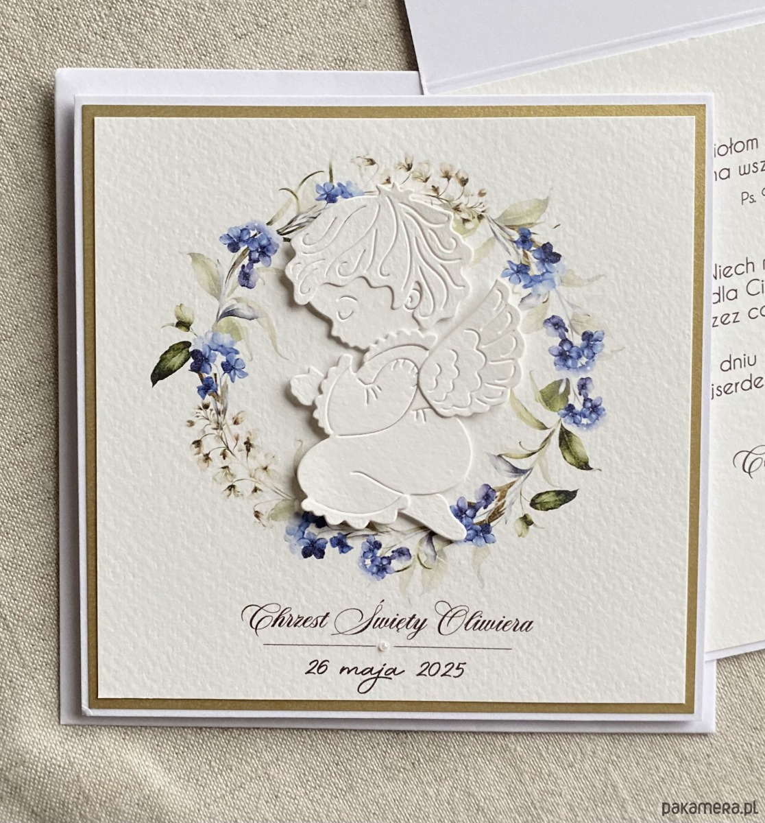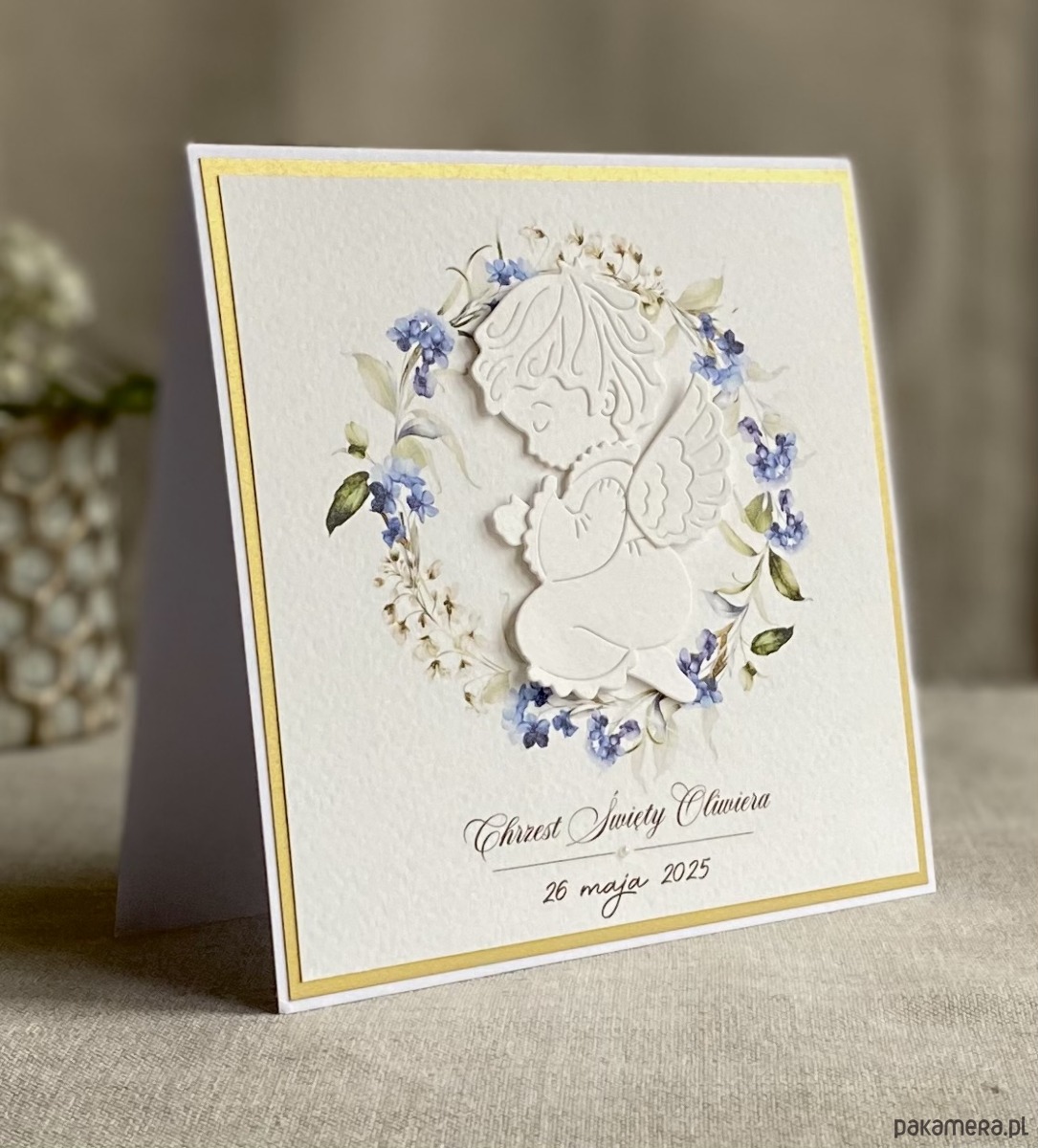 Elegancka, ręcznie wykonana, personalizowana kartka z okazji chrztu w ozdobnej kopercie.