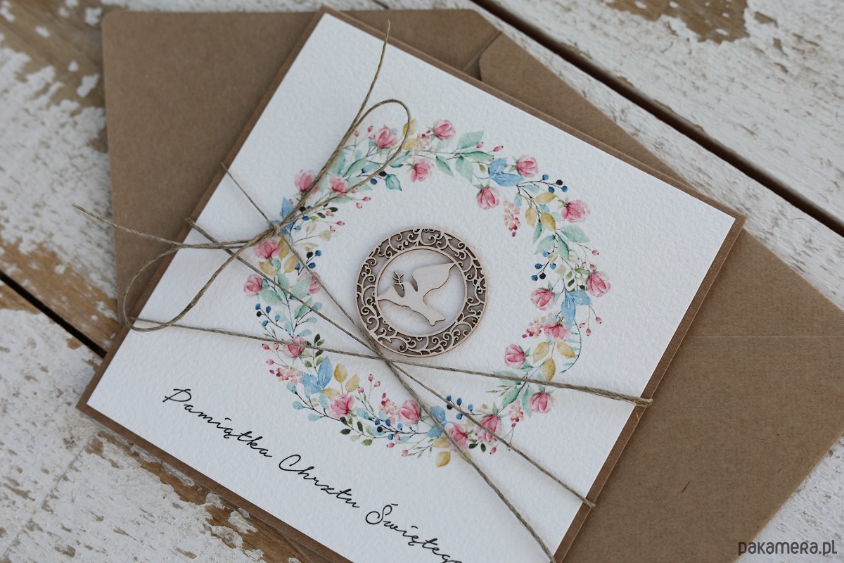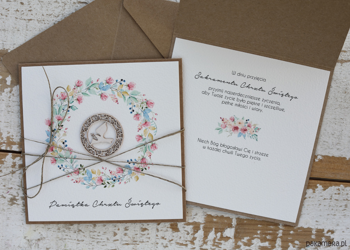 Wyjątkowa kartka na chrzciny - pamiątka chrztu wykonana z produktów eko w tym z papieru kraftowego, bawełnianego 100%, tekturkowej ozdoby, przewiązana lnianym sznureczkiem.