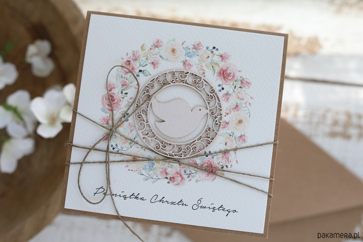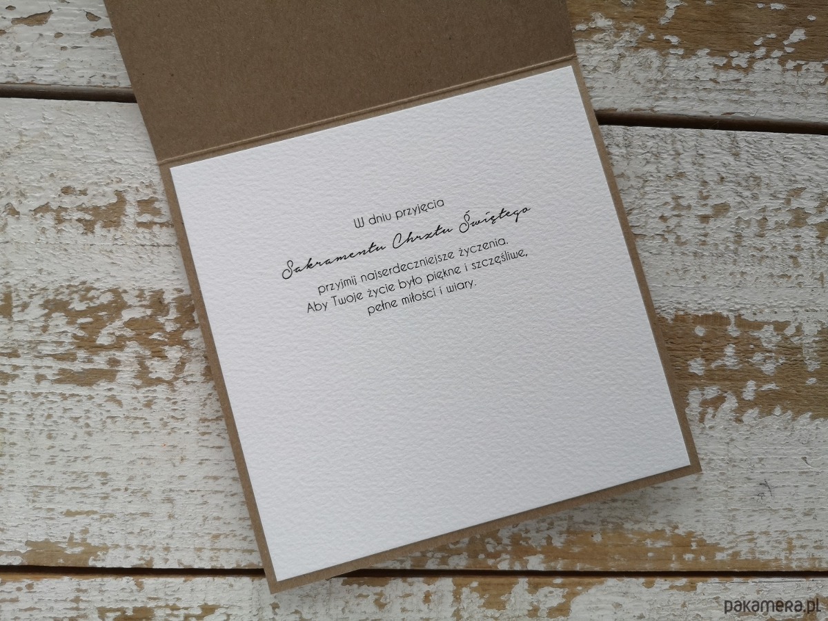 Wyjątkowa kartka na chrzciny - pamiątka chrztu wykonana z produktów eko w tym z papieru kraftowego, bawełnianego 100%, tekturkowej ozdoby, przewiązana lnianym sznureczkiem.