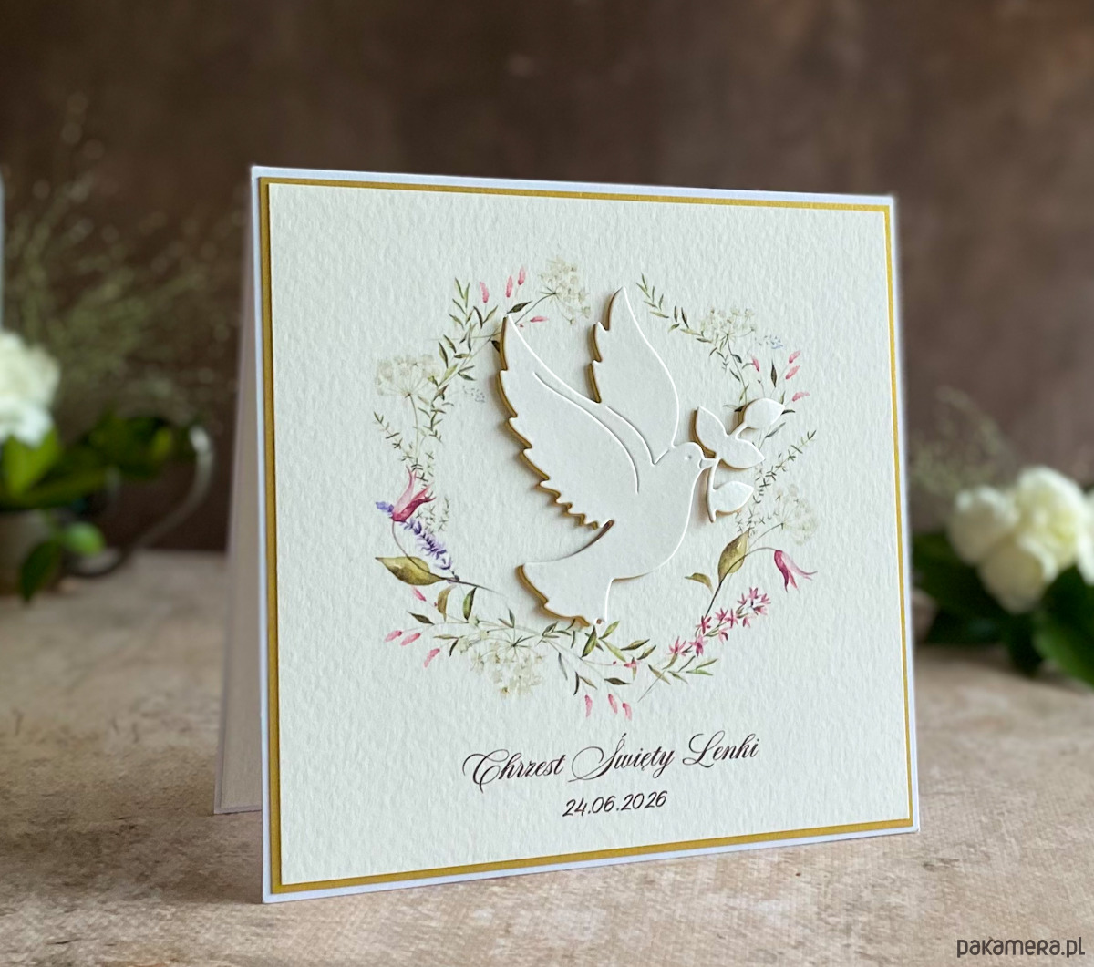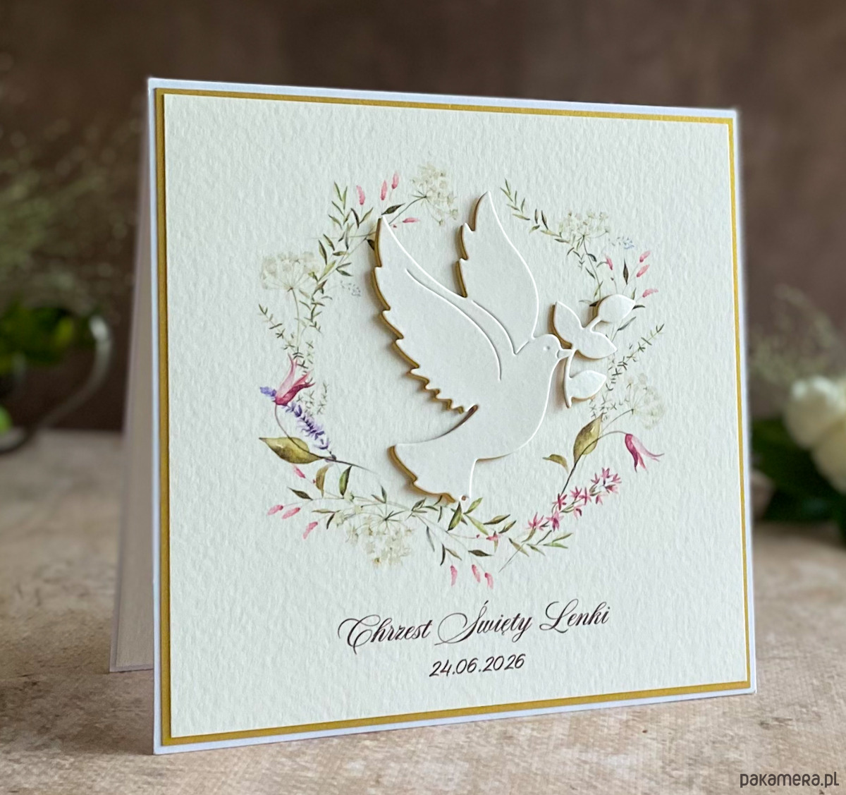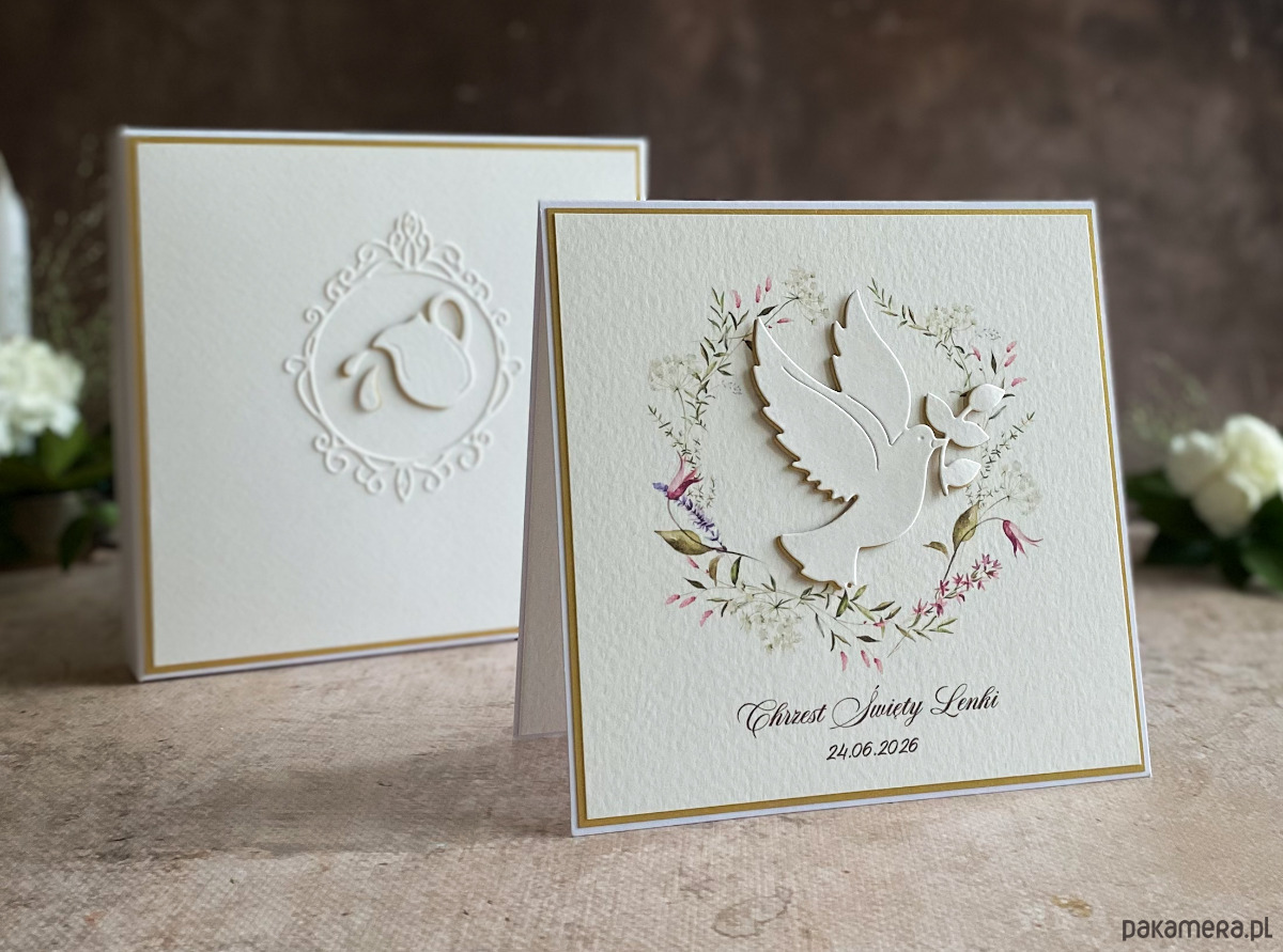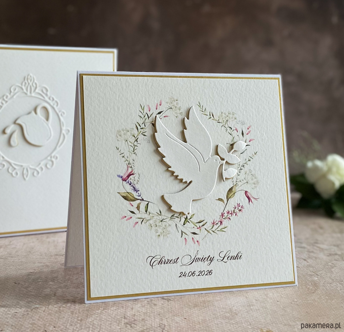 Elegancka, ręcznie wykonana, personalizowana pamiątka chrztu, kartka w pudełku z ozdobną kopertą.