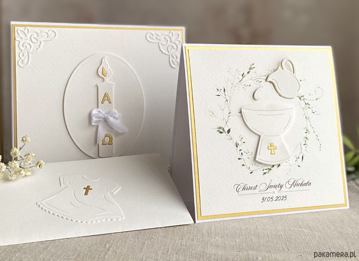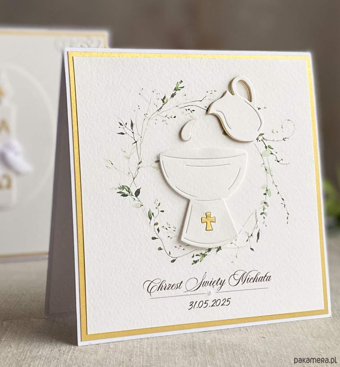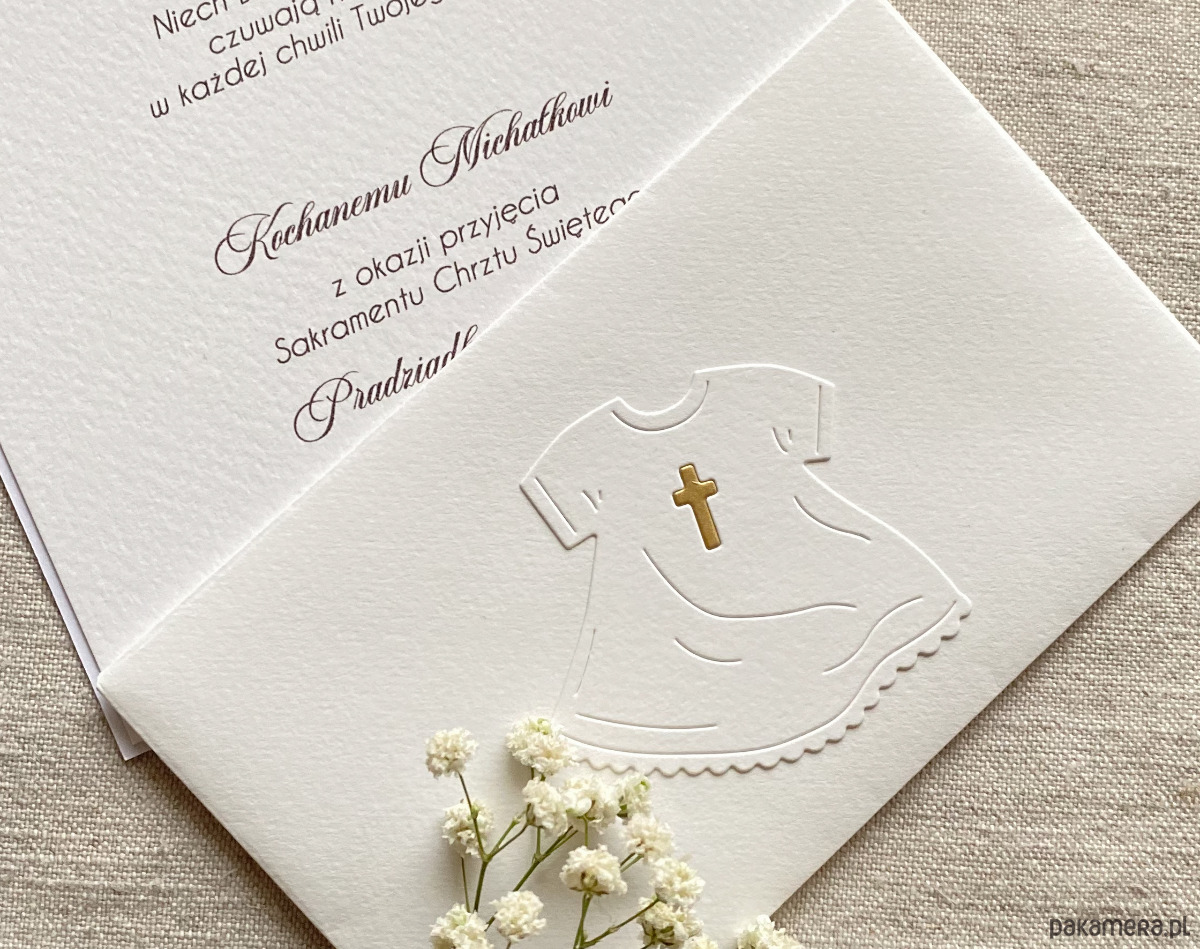 Elegancka, ręcznie wykonana, personalizowana pamiątka chrztu, kartka w pudełku z ozdobną kopertą.