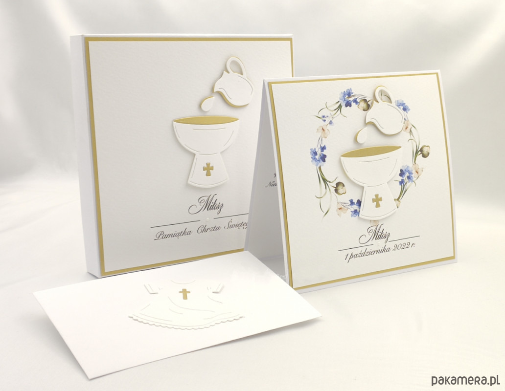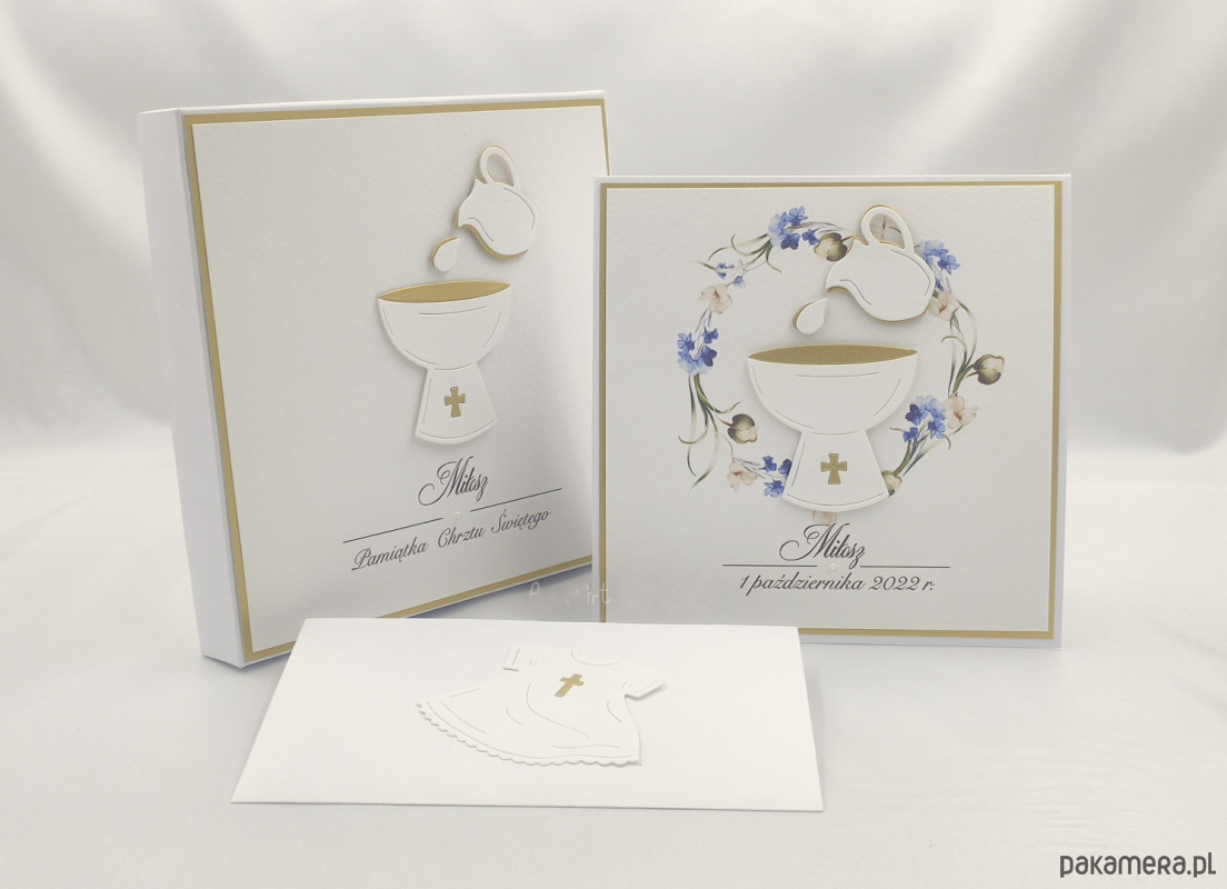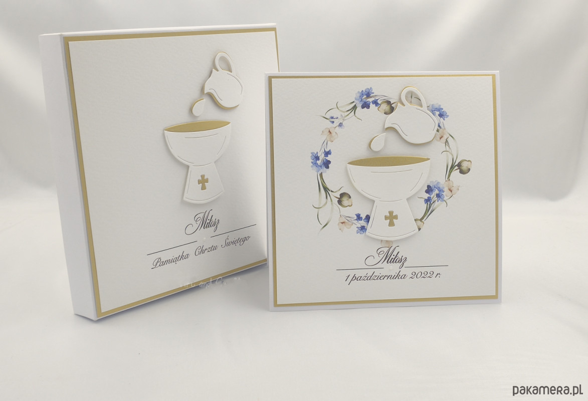 Elegancka, ręcznie wykonana pamiątka chrztu dla chłopca, kartka w pudełku z ozdobną kopertą.