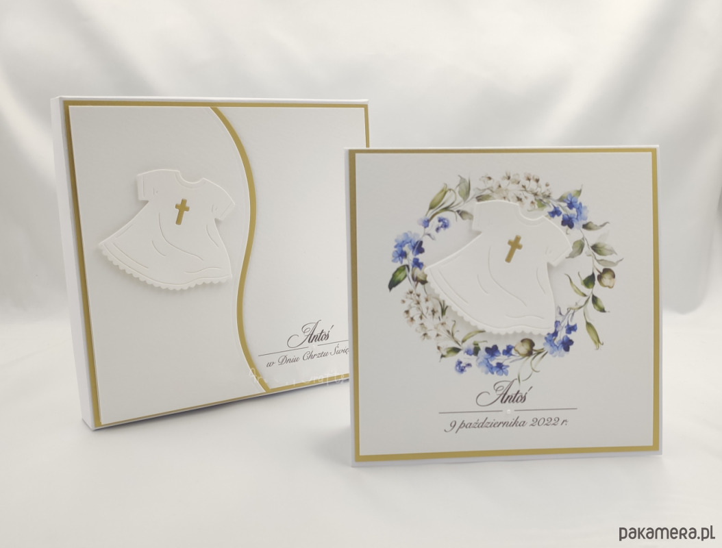 Elegancka, ręcznie wykonana pamiątka chrztu dla chłopca, kartka w pudełku z ozdobną kopertą.